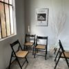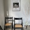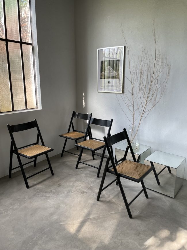 On adore leur design épuré, le contraste encore le bois noir et l’assise en cannage clair. Chaque chaise peut être pliée facilement pour un gain de place certain.