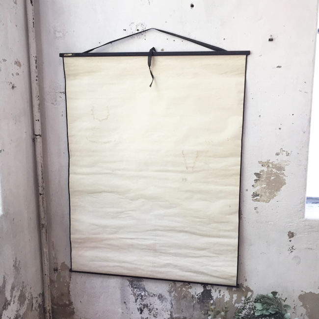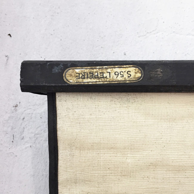 Datée de 1958, l’affiche est sérigraphiée sur papier enduit, entoilé et tenu par deux baguettes en bois noir.