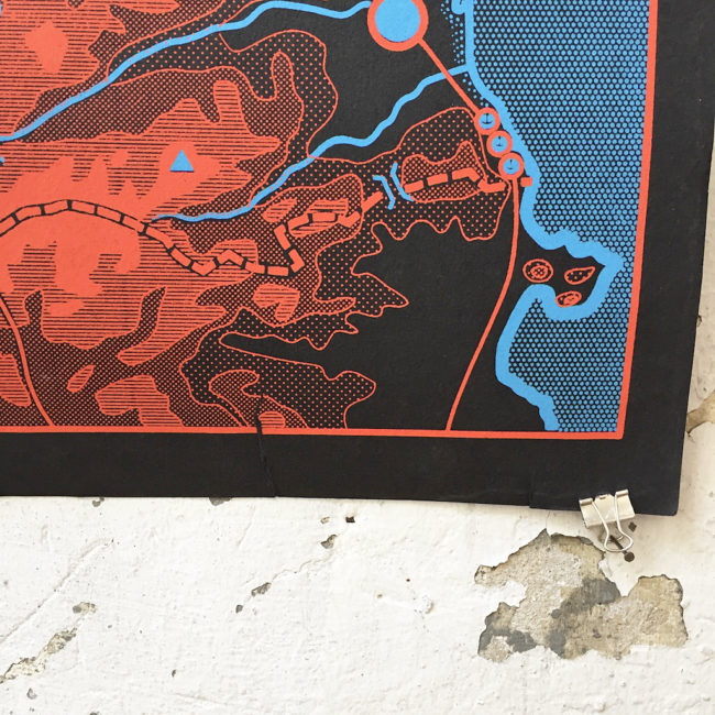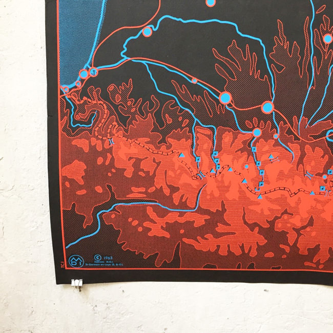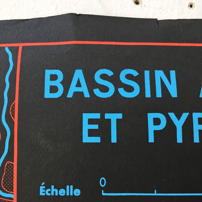 Ancienne carte scolaire géographique sur papier noir sérigraphiée.