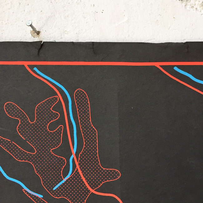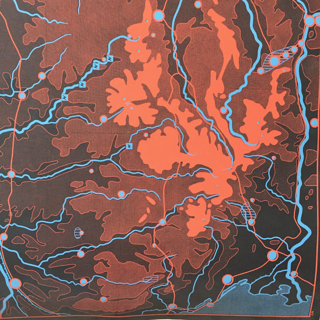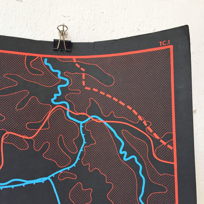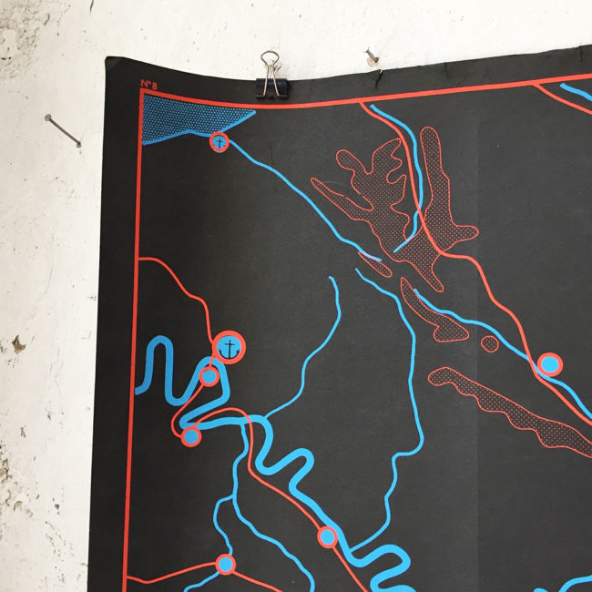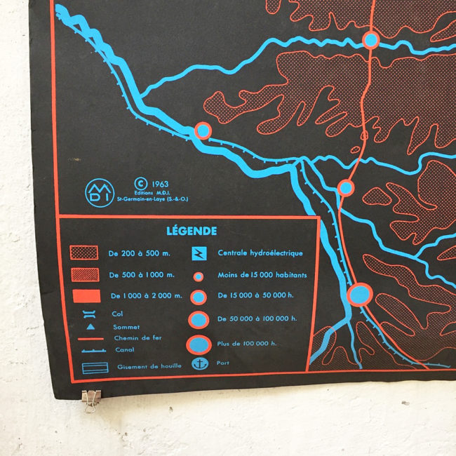 Ancienne carte scolaire géographique sur papier noir sérigraphiée.