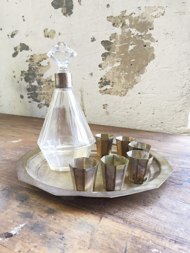 Ancien lot composé d’une carafe en verre à forme géométrique avec ses 6 petits verres à liqueur et son plateau en laiton.