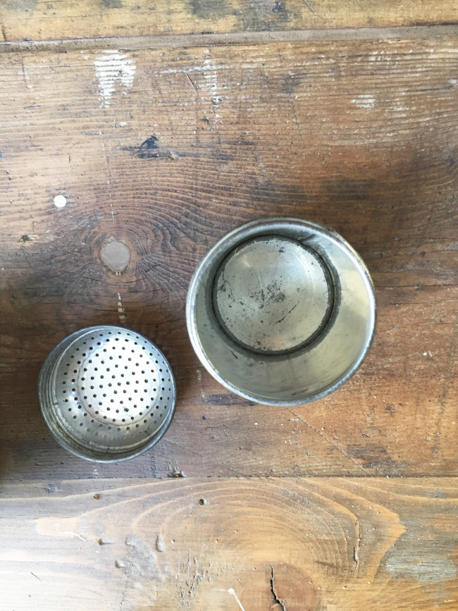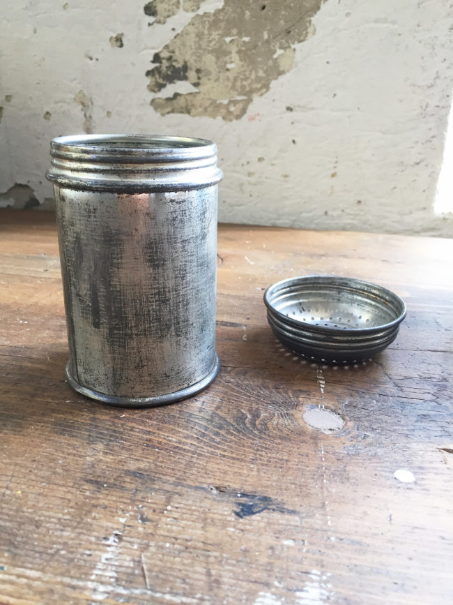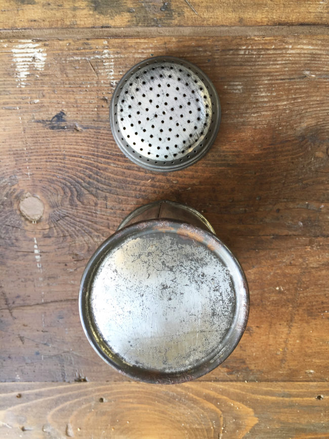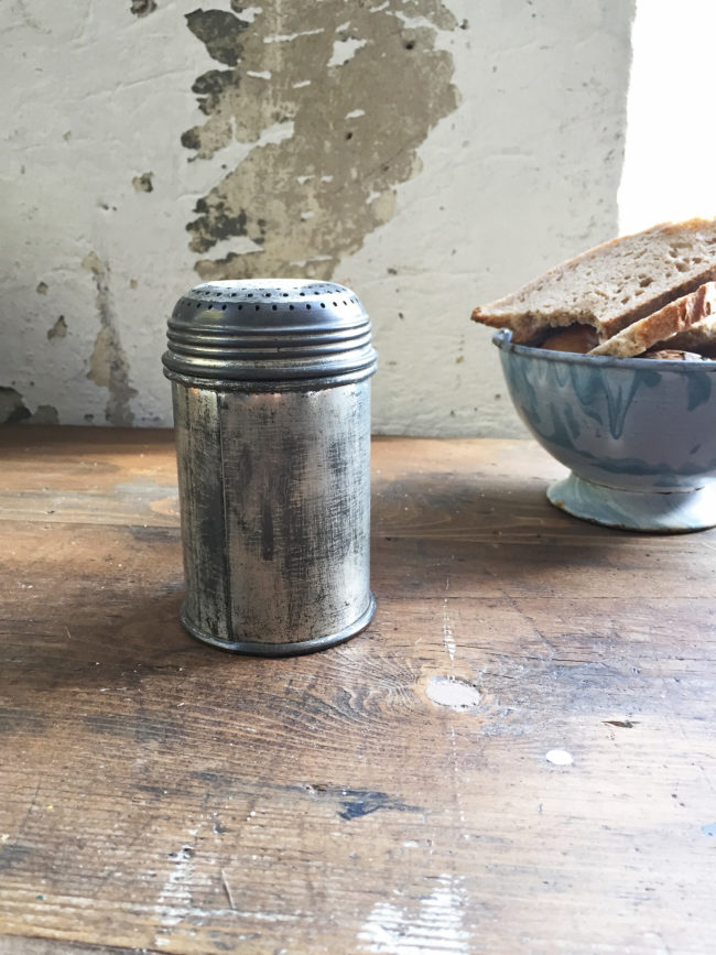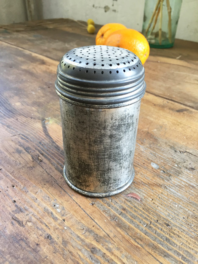 Ancienne saupoudreuse à sure glace en métal patiné.