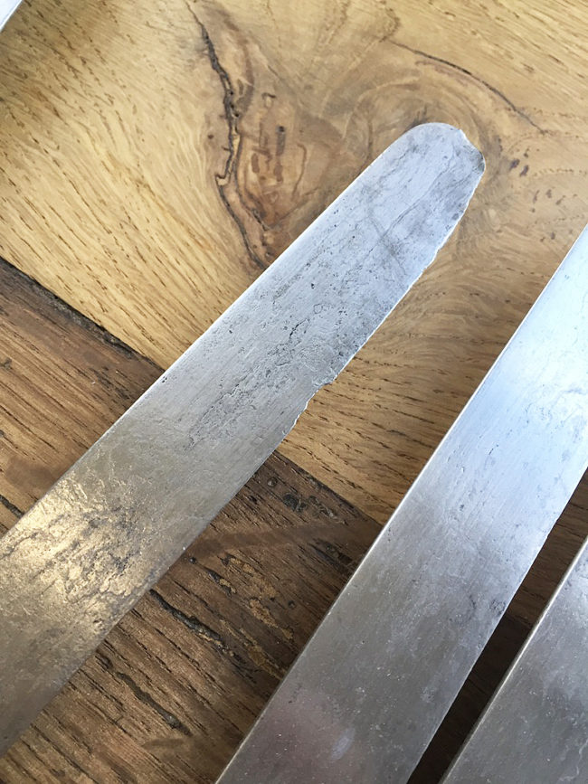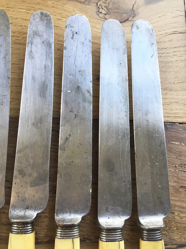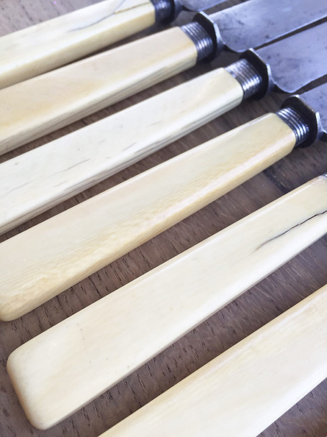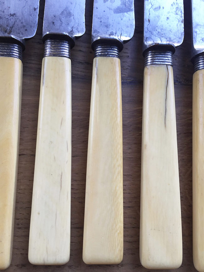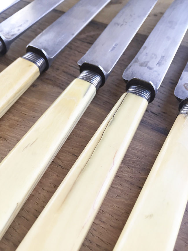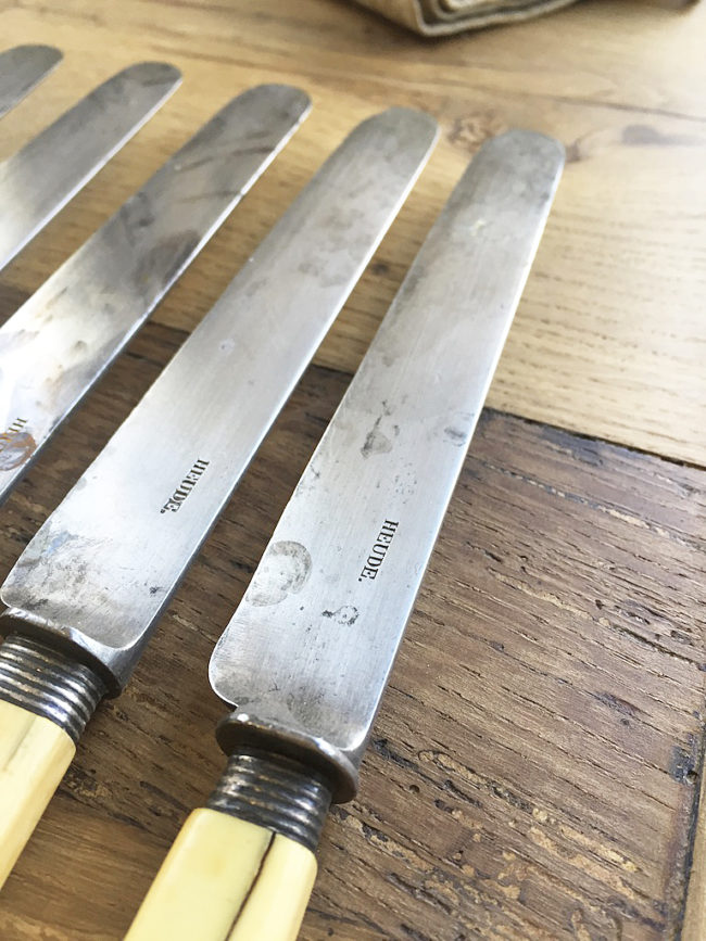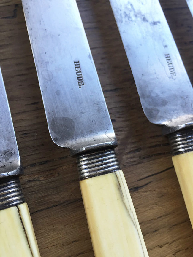 Ces couteaux sont anciens, le manche a travaillé par endroits. Deux lames, marquées Heude, sont un peu abimées, comme l’attestent les photos.
