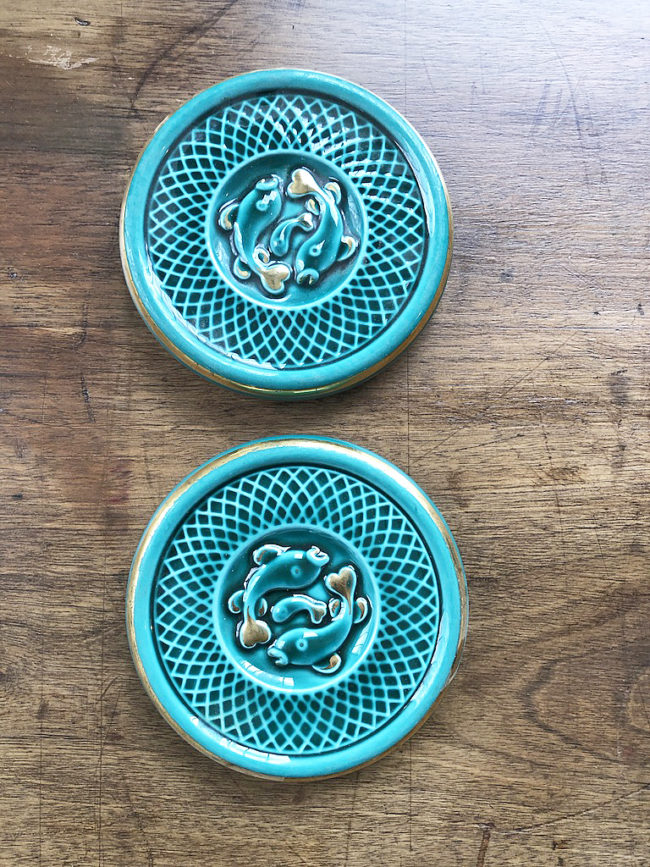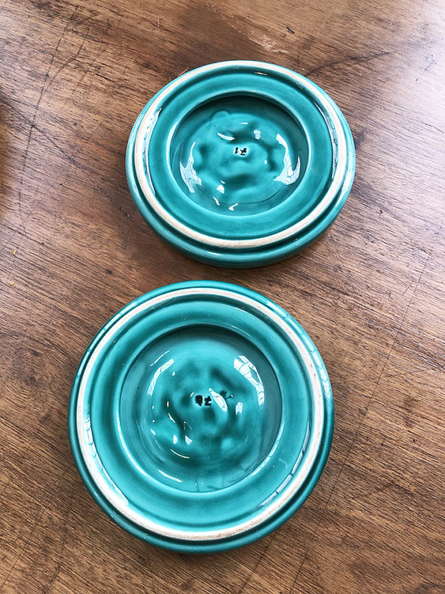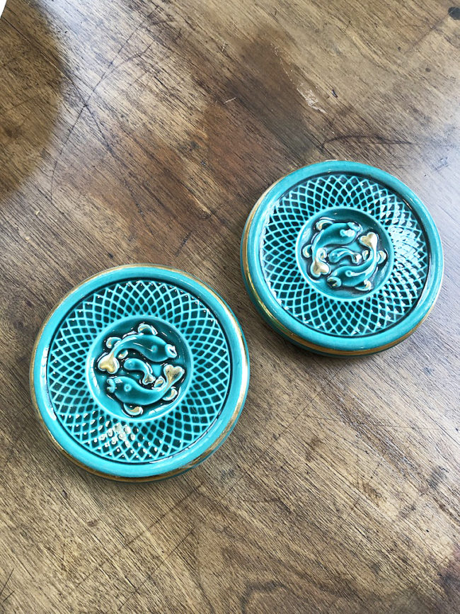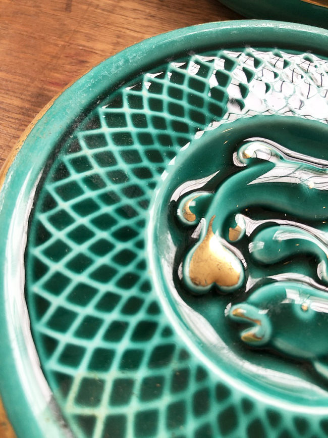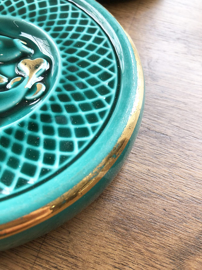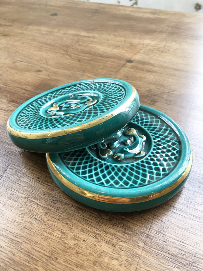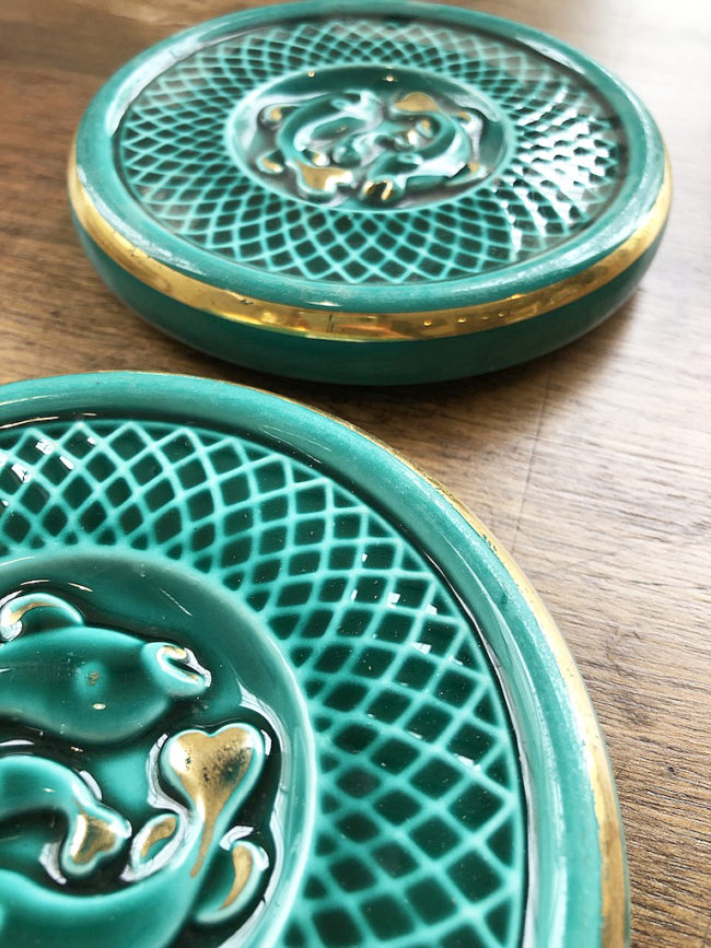 Deux dessous de bouteilles ou plat en céramique verte Vallauris, à motifs poisson rehaussé de détails dorés.