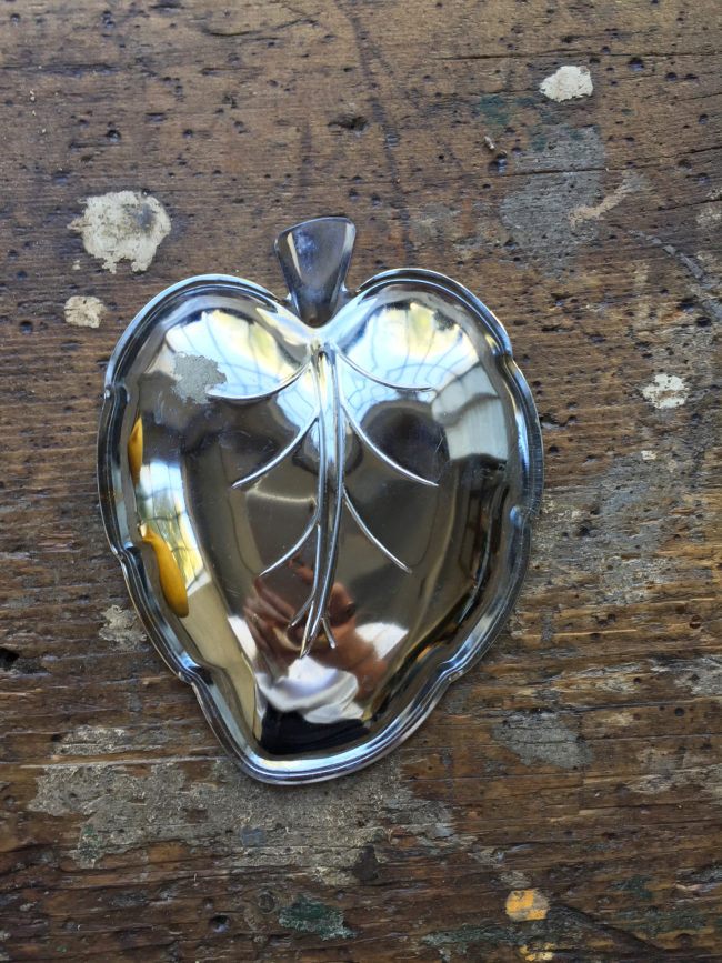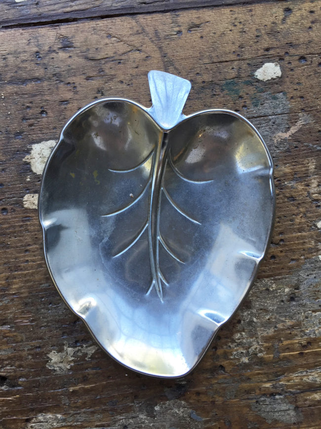 Vide-poche vintage en forme de feuille en métal chromé.