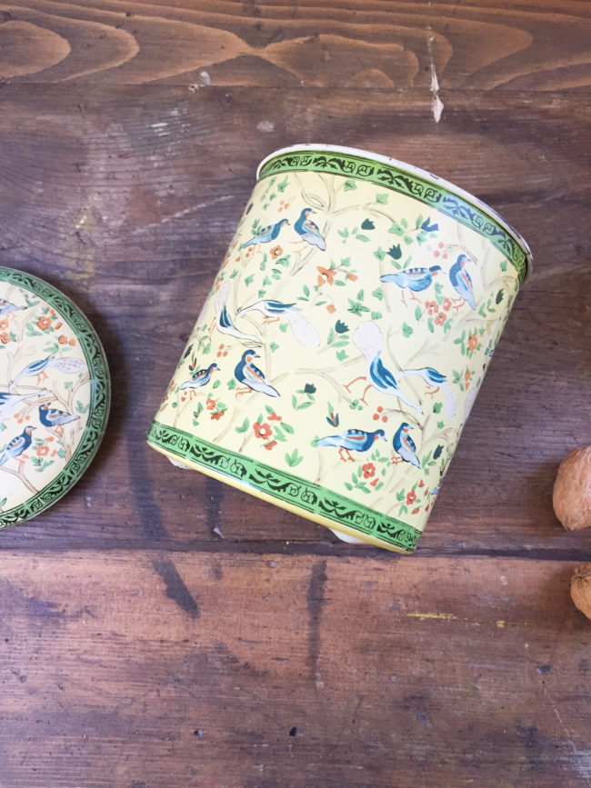 Ancienne petite boîte en tôle métallique et émail avec motifs fleuris et oiseaux.