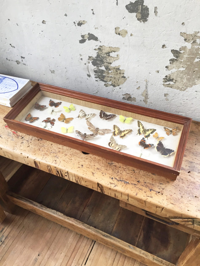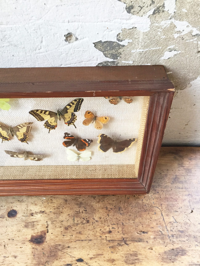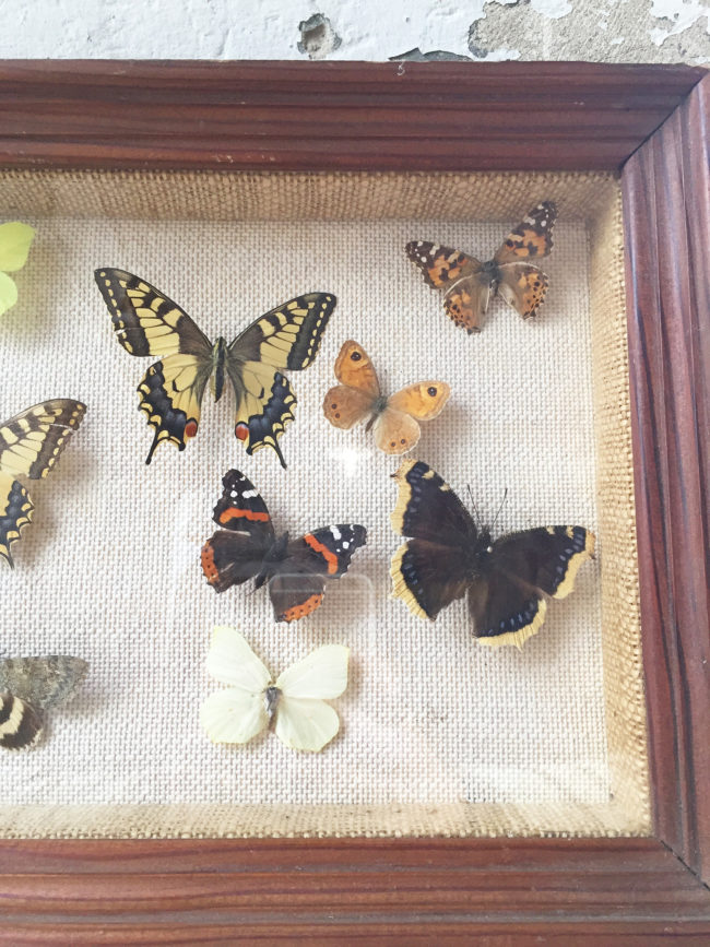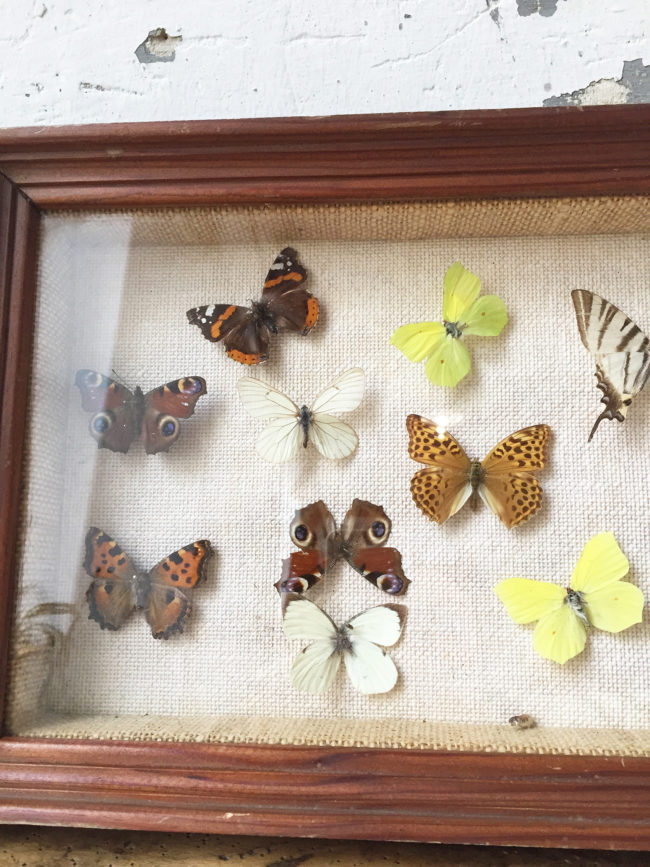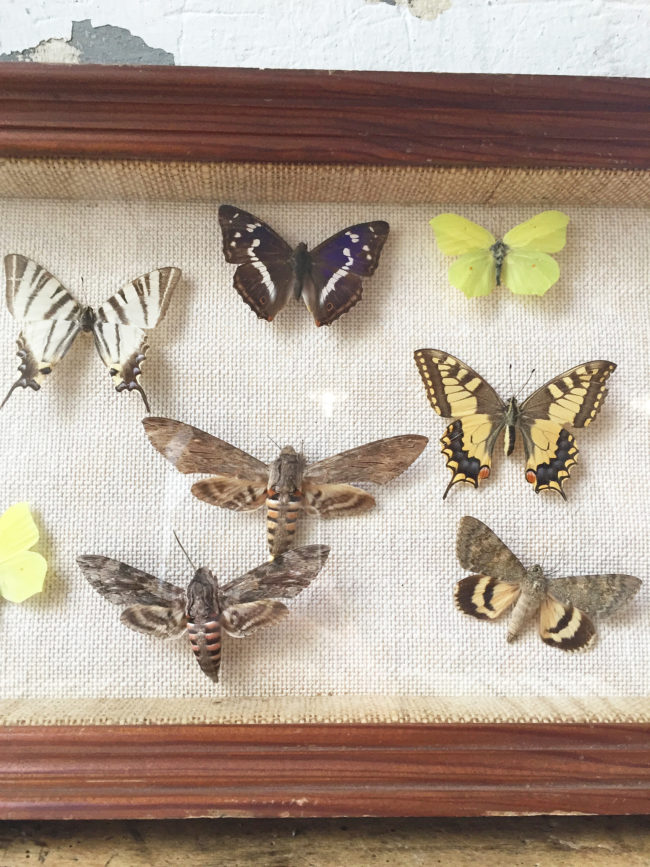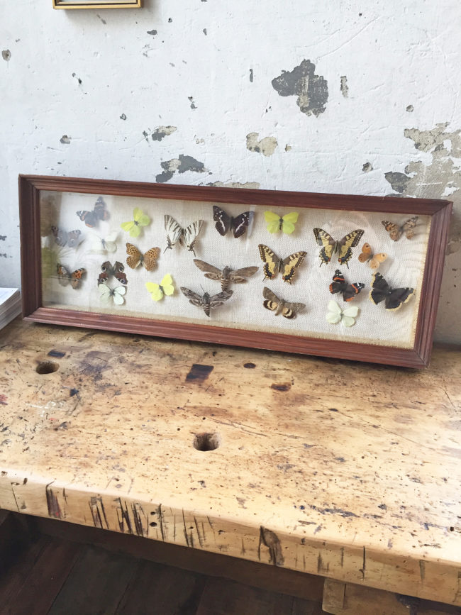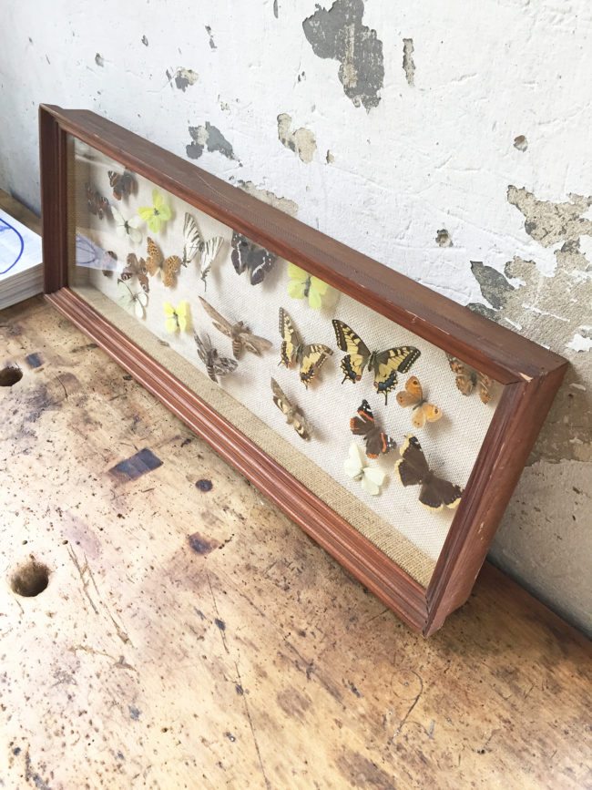 Ancien grand cadre contenant une compostions avec de nombreux papillons naturalisés.