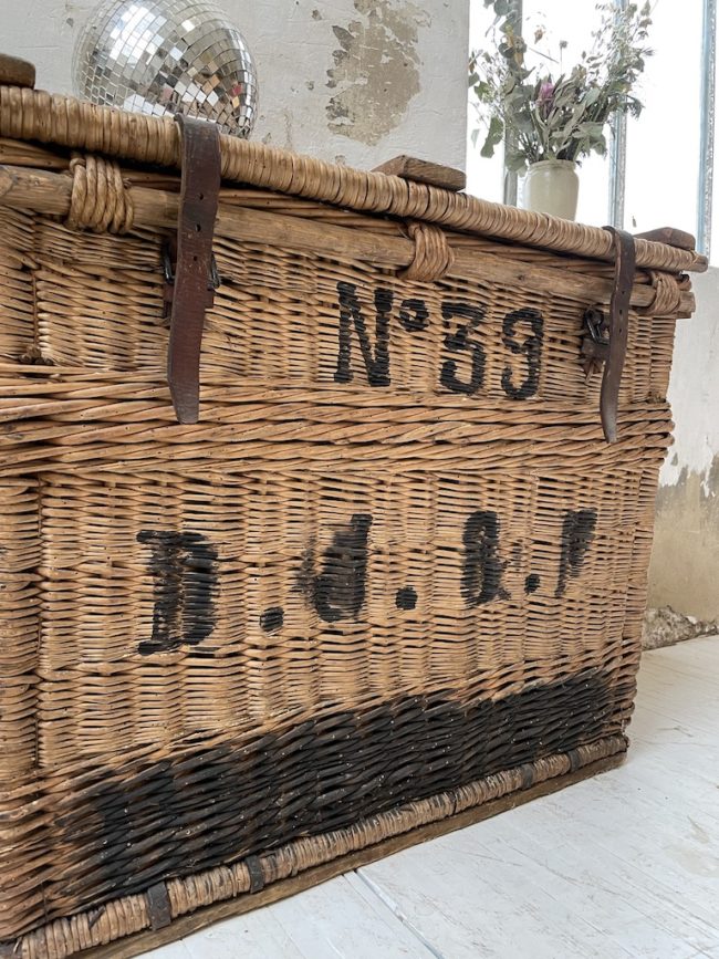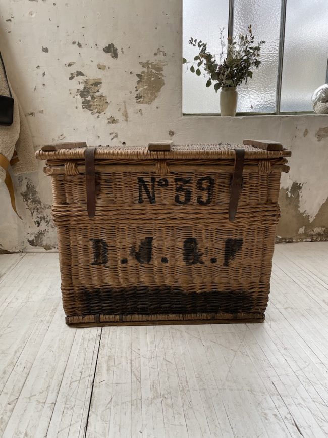 Ancienne grande malle en osier avec ses inscriptions noires n°39 BJ&F, du début des années 1900.