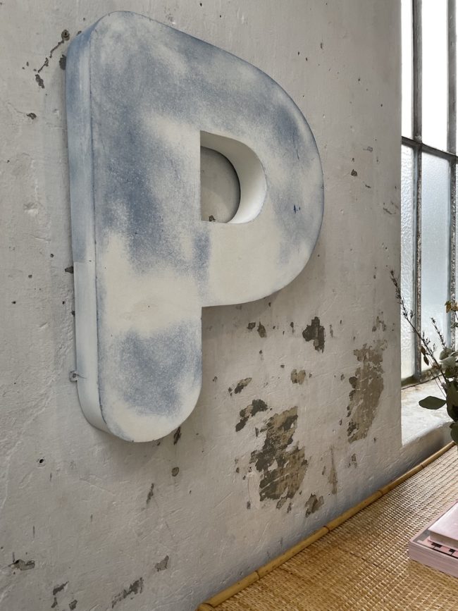 Ancienne lettre d’enseigne en métal blanche patinée bleue.
