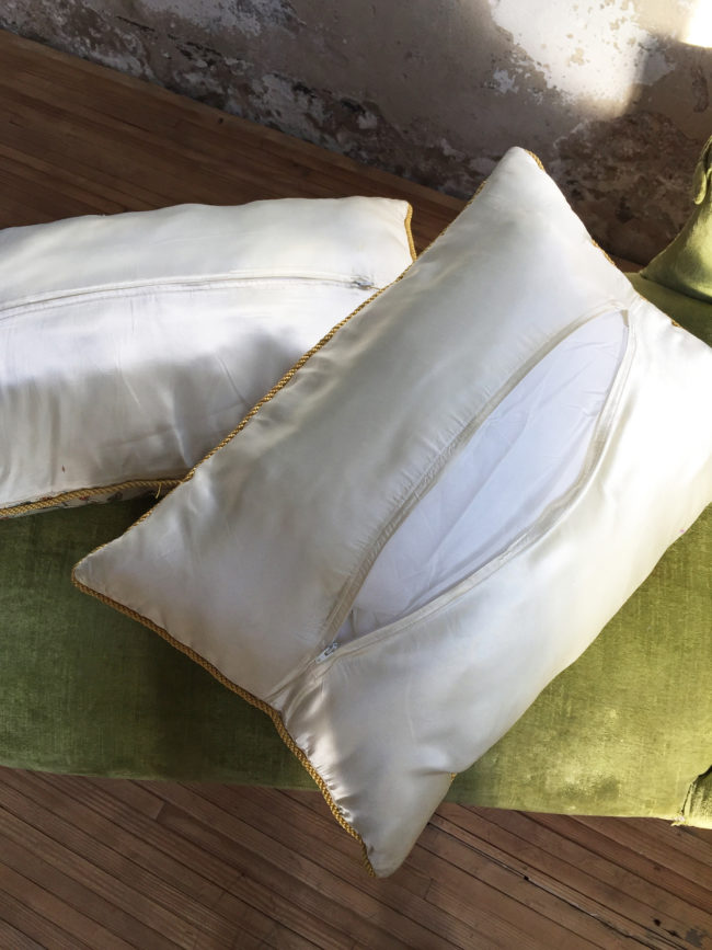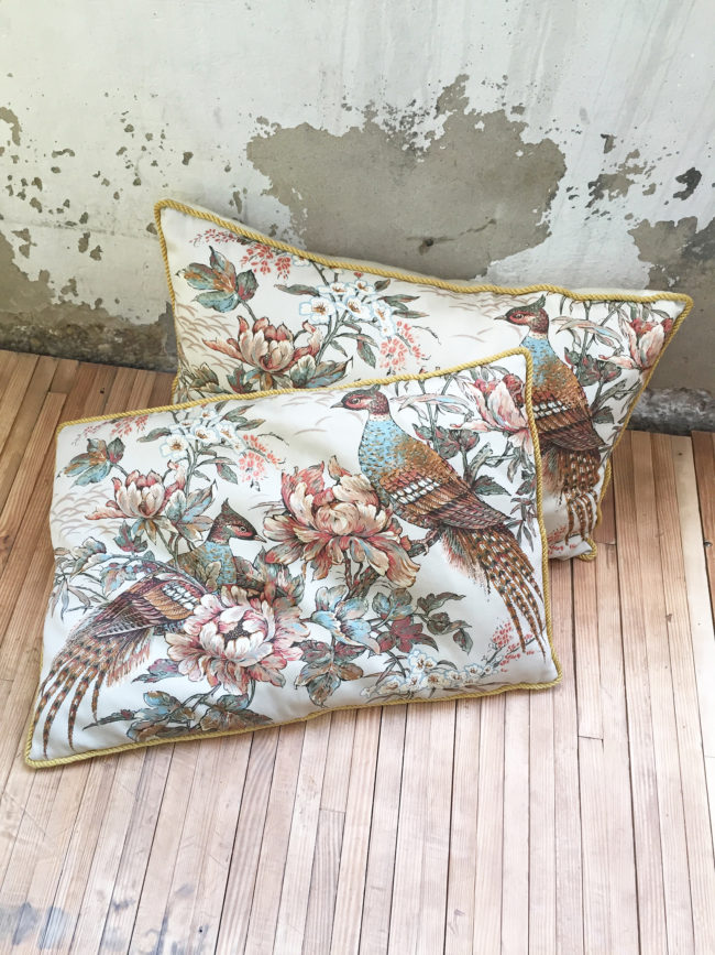 Ancienne paire de coussins en tissu satiné représentant des oiseaux.
