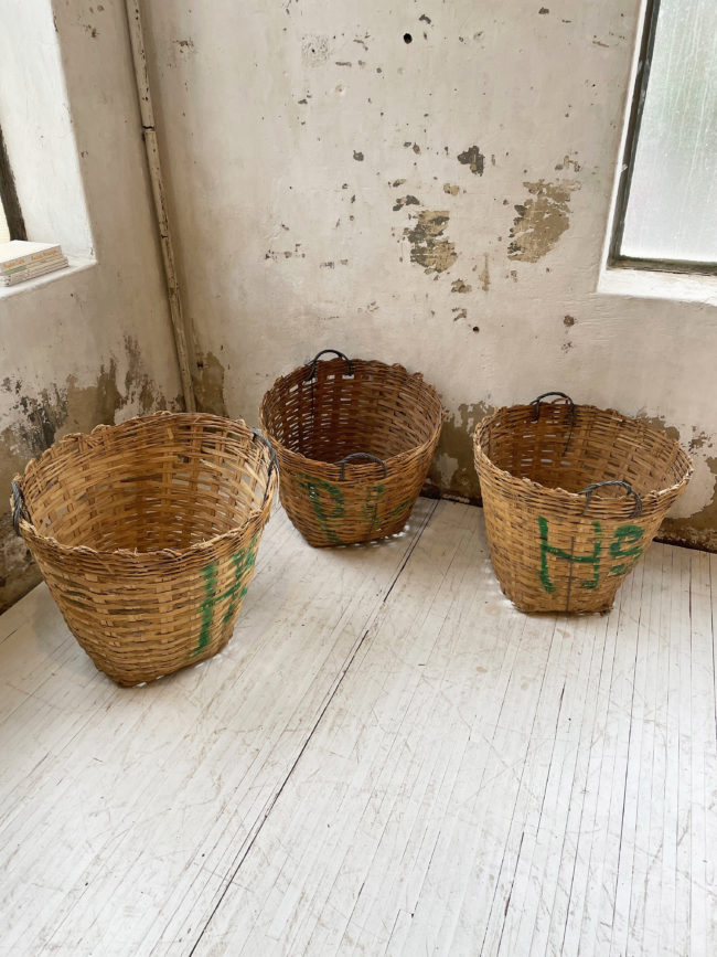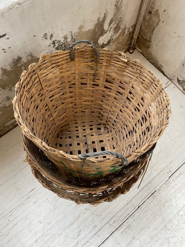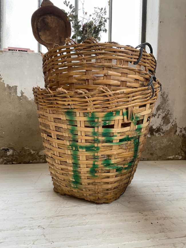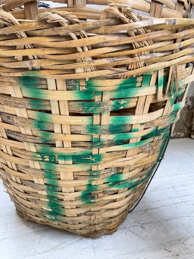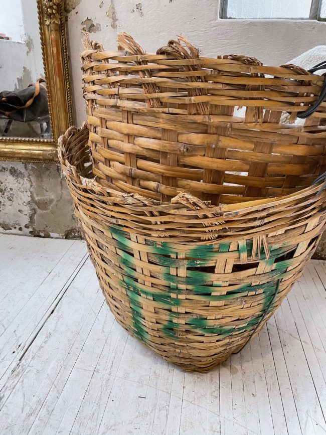 Anses en métal tressé sur les côtés, inscriptions HS à la spray verte (paniers issus d’une ancienne entreprise).