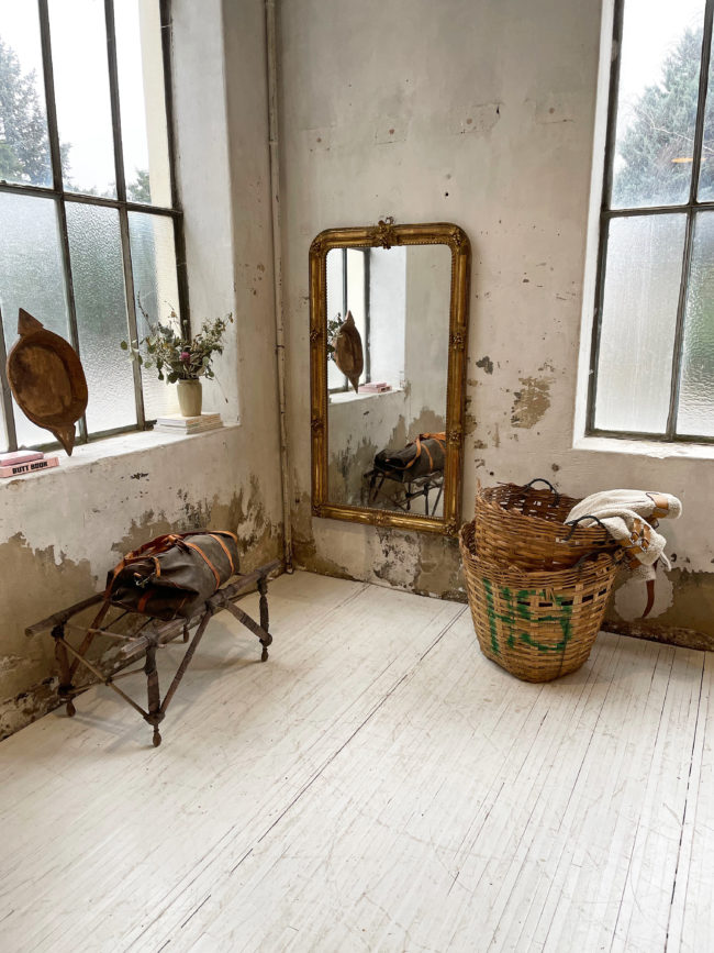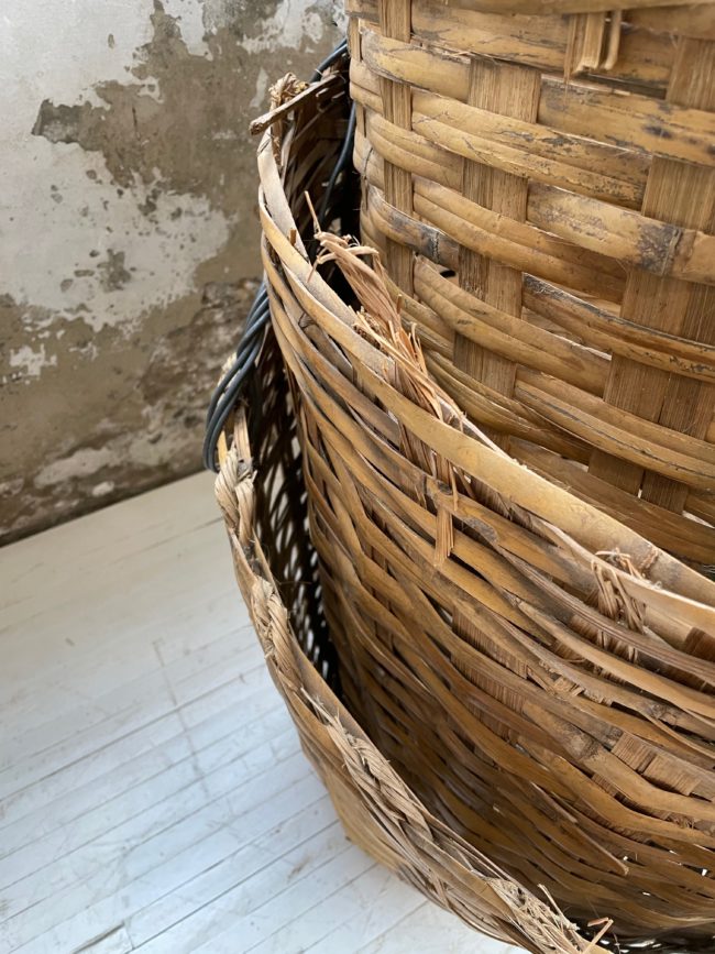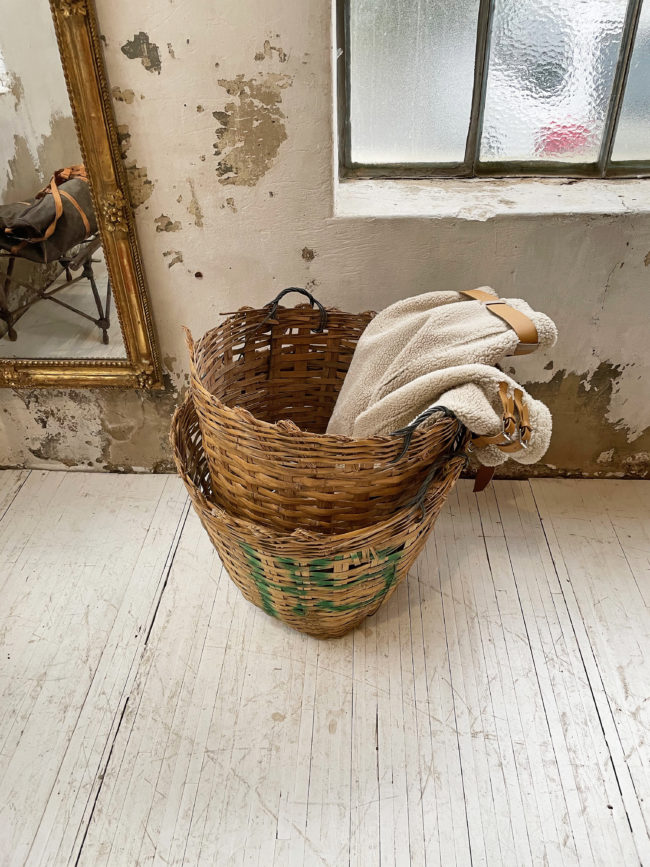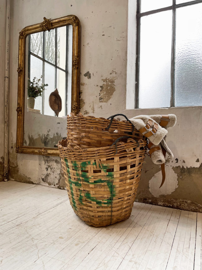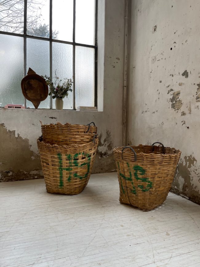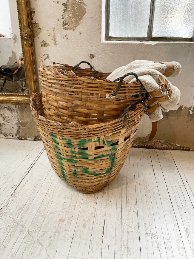 Anses en métal tressé sur les côtés, inscriptions HS à la spray verte (paniers issus d’une ancienne entreprise).