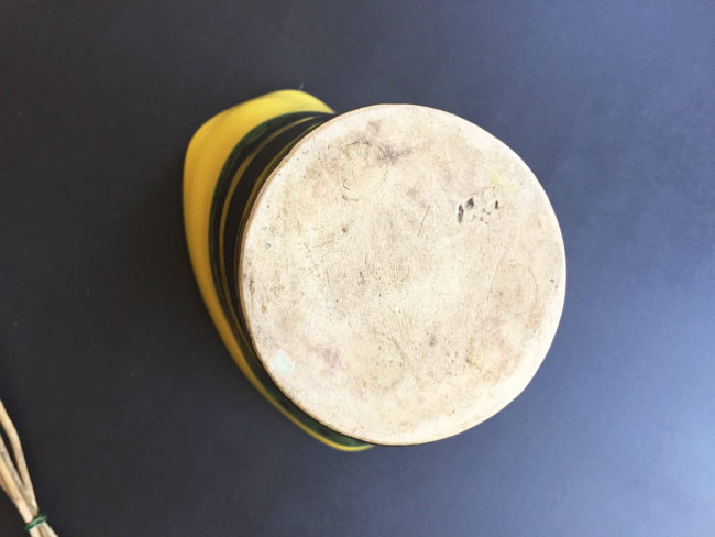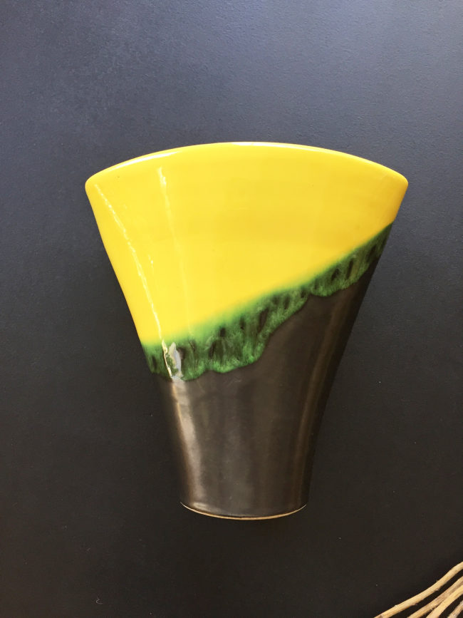 Ancien vase en céramique tricolore – jaune, noir et vert.