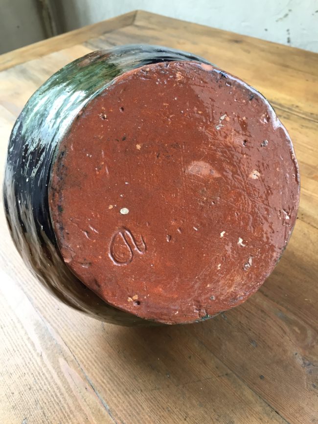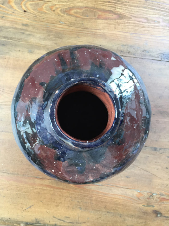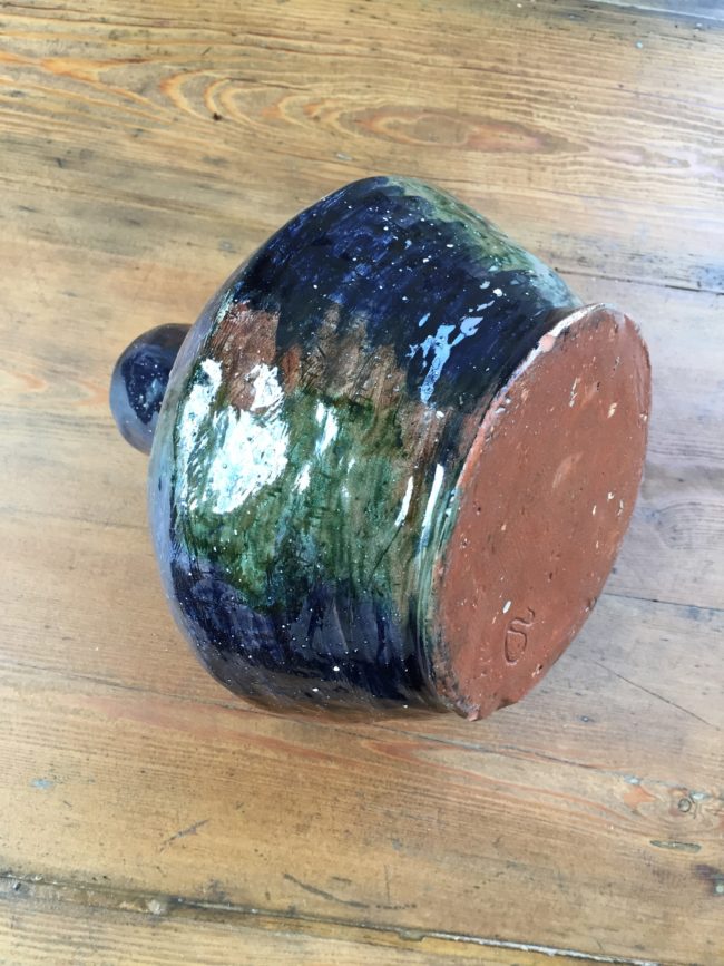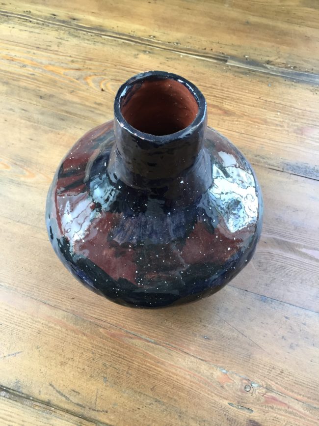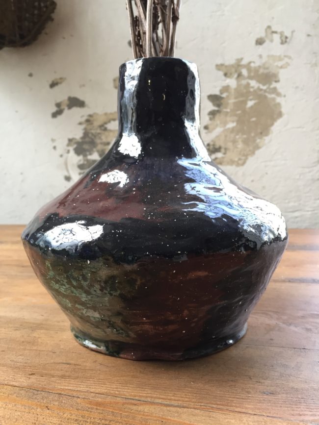 Ancien petit vase en terre cuite avec ses couleurs vives et sa peinture mouchetée.