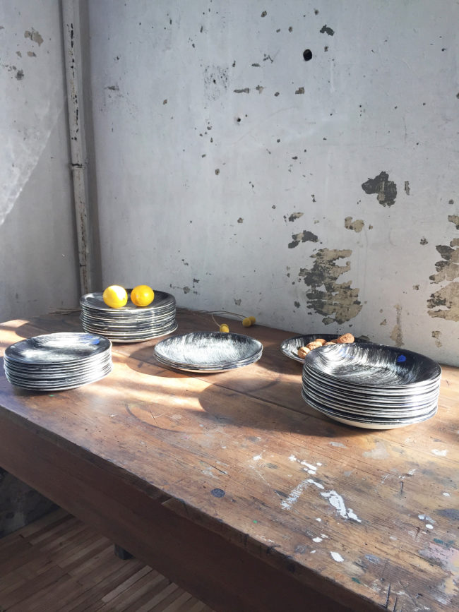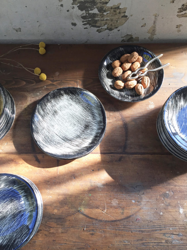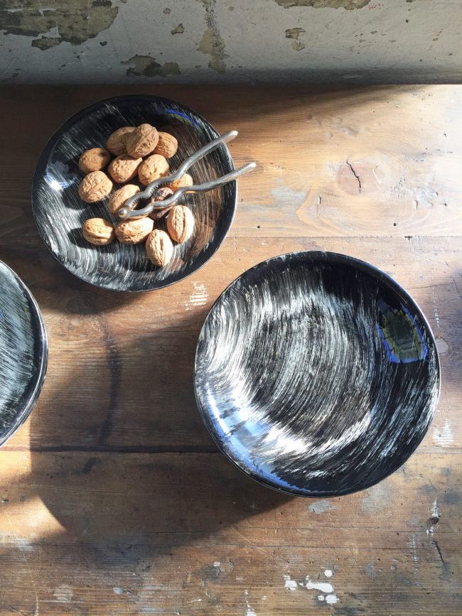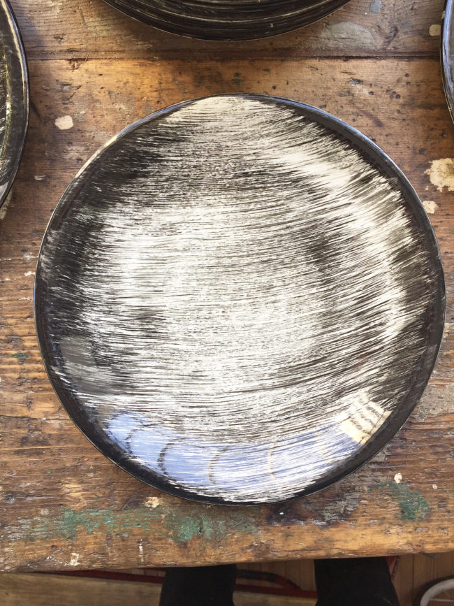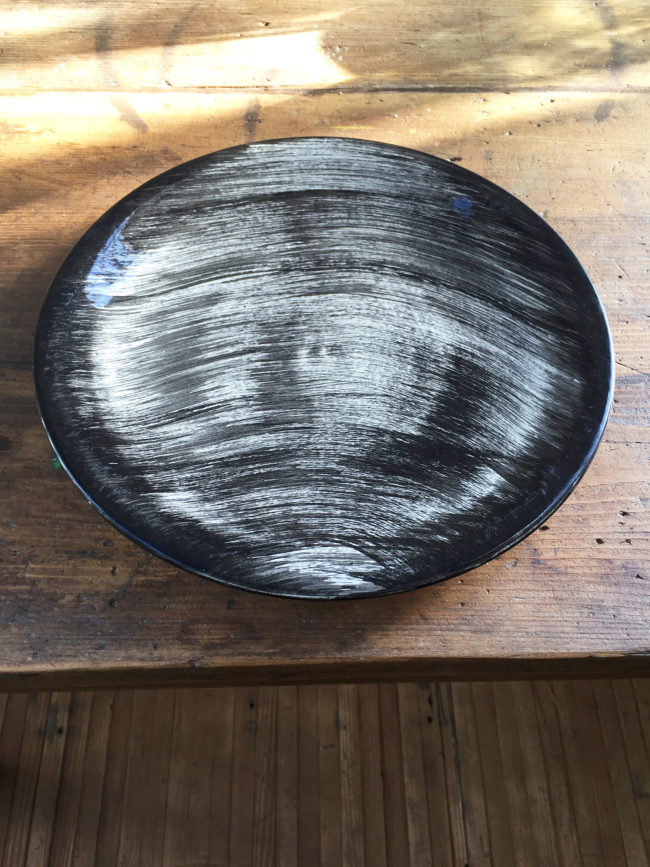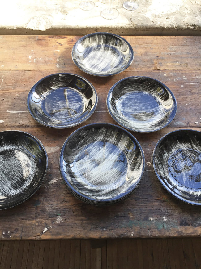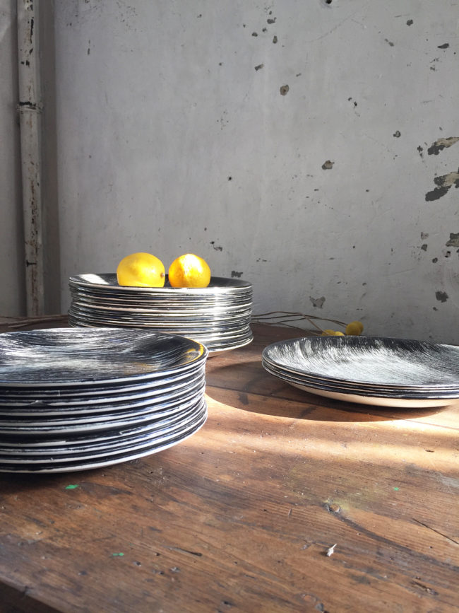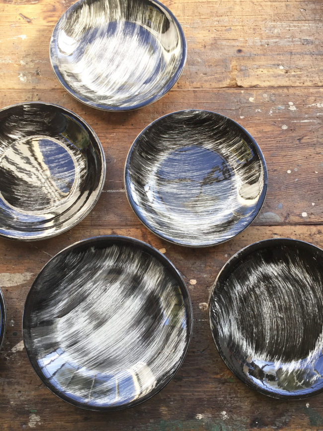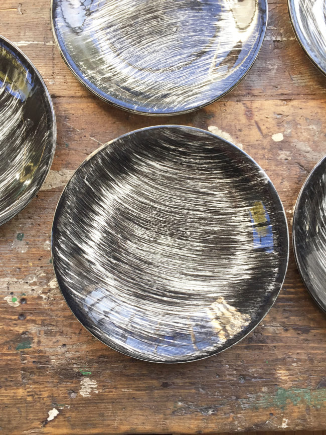 Ces assiettes rares à trouver possèdent un décor de coups de brosses croisées de couleur noire peints à la main, leur conférant un motif graphique merveilleux.