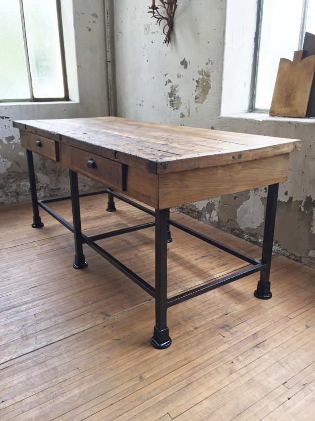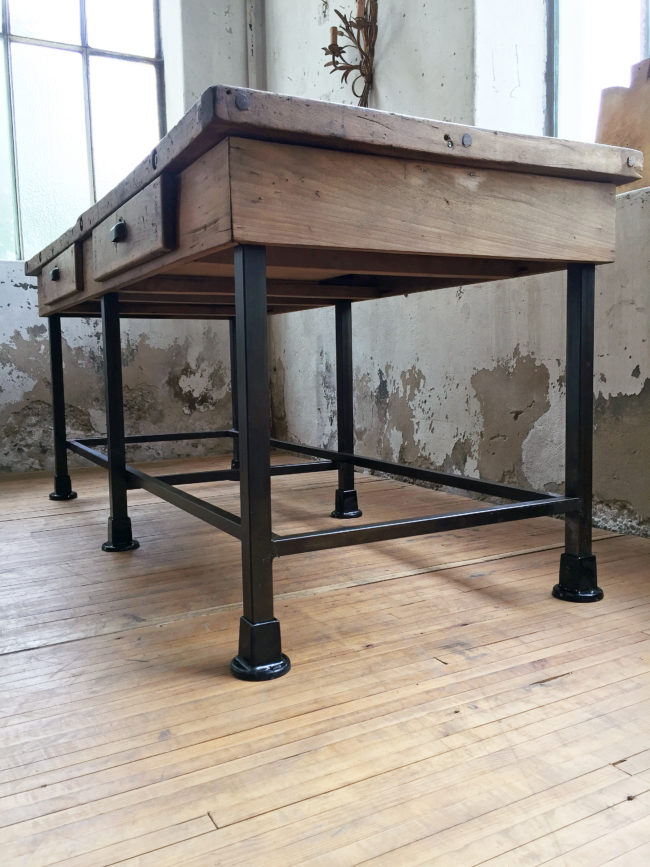Cet établi possède des détails authentiques, un plateau en chêne joliment patiné, des sabots en métal émaillé, ainsi que deux larges tiroirs permettant un rangement d’appoint.