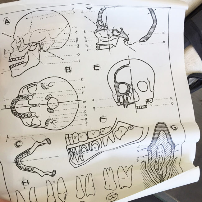 Affiche scolaire représentant le crâne humain + dentition, issue de la série décélère médecin français Dr Auzoux et illustrée par P.Sougy.