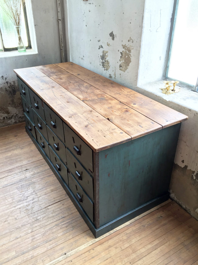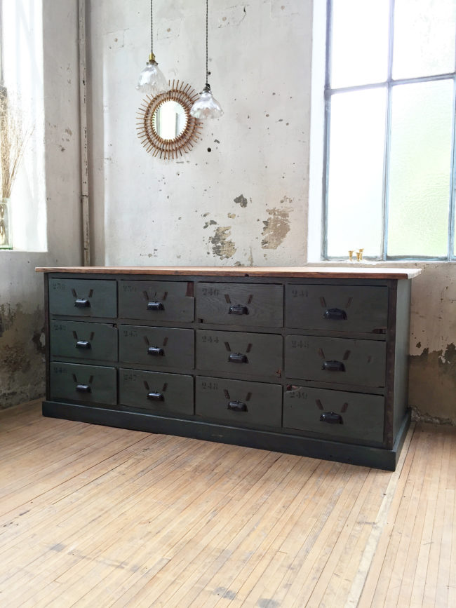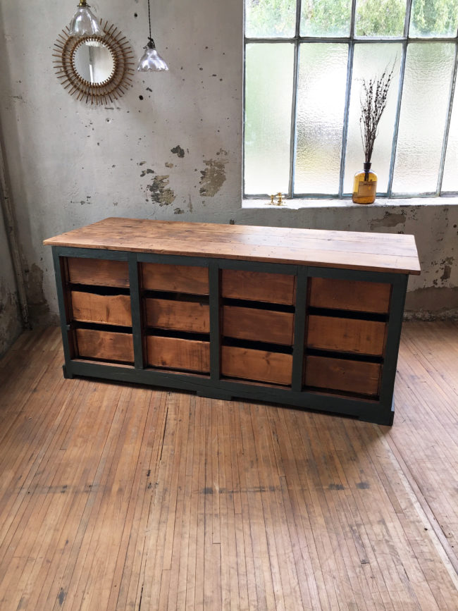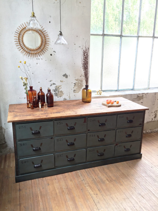 Ce meuble de métier trouvera aussi bien une place de choix en enfilade dans un salon, ou alors utilisée dans une boutique.