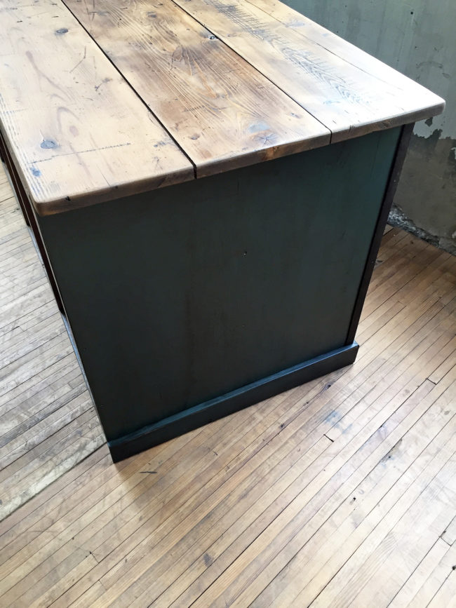 Ancienne banque de métier en chêne et pin composées de 12 grands tiroirs à poignées coquille noires.