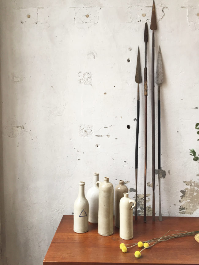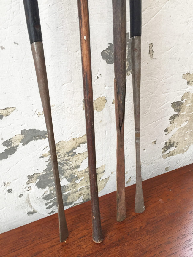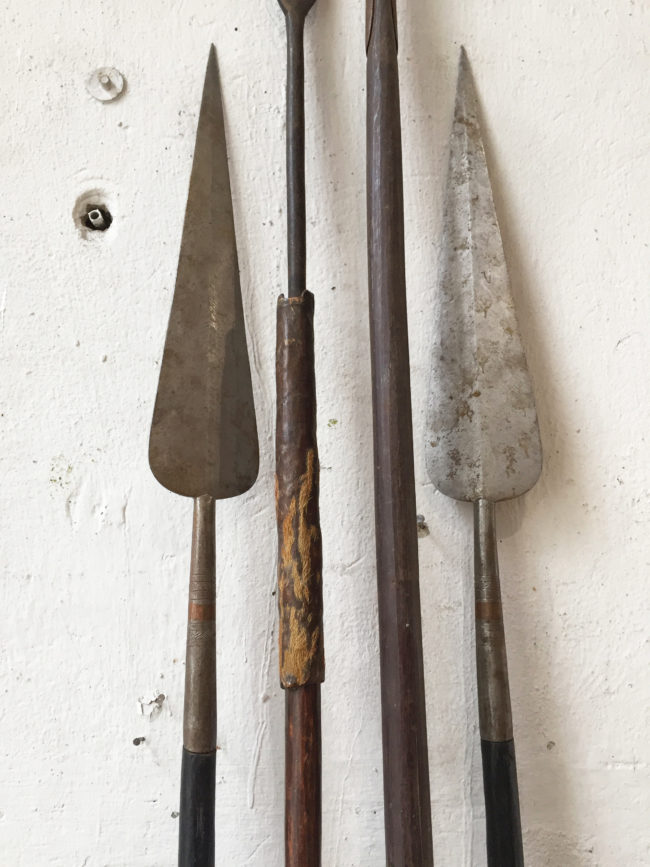 Elles sont en bois et en metal. Les lames sont gravées de motifs graphiques. Les lances possèdent une belle patine d’usage.