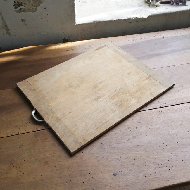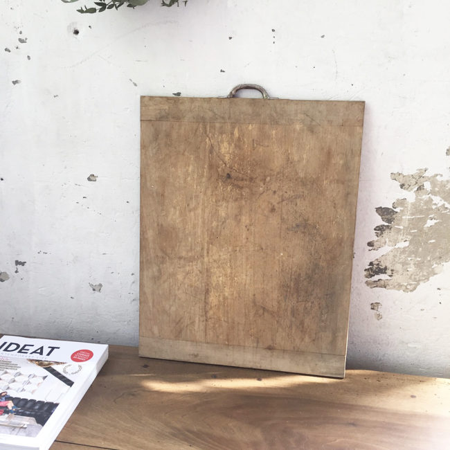 Ancienne grande planche à découper en bois avec sa poignée métallique.