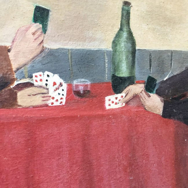 La toile représente deux hommes jouant, attablés dans la rue, buvant du vin et jouant aux cartes.