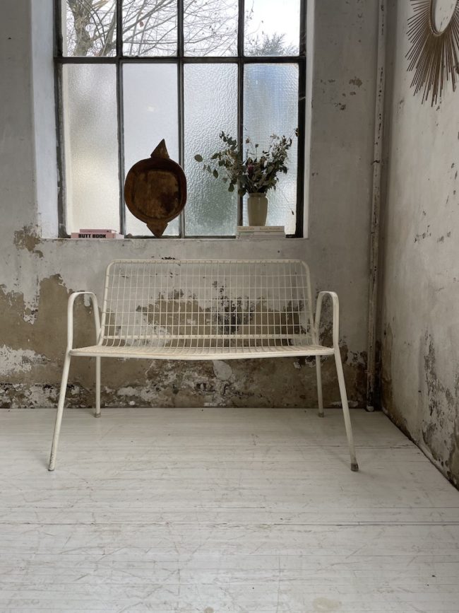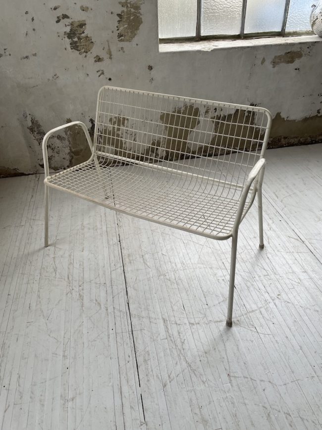 Ancien banc EMU modèle Rio, modèle vintage des années 60 en métal patiné blanc.