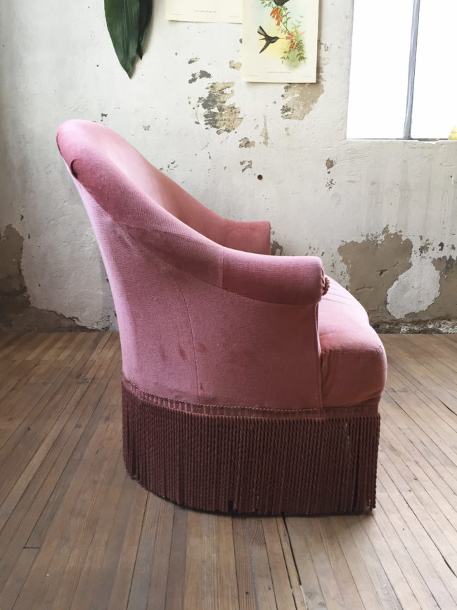 Adorable petite banquette crapaud en velours rose.