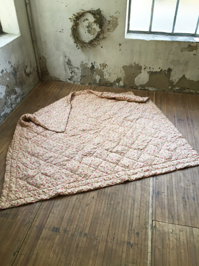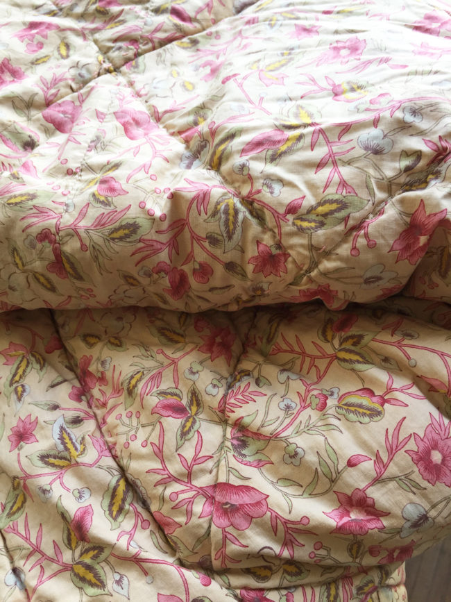 Ancien édredon-boutis aux motifs fleuris dans des tonalités rose.