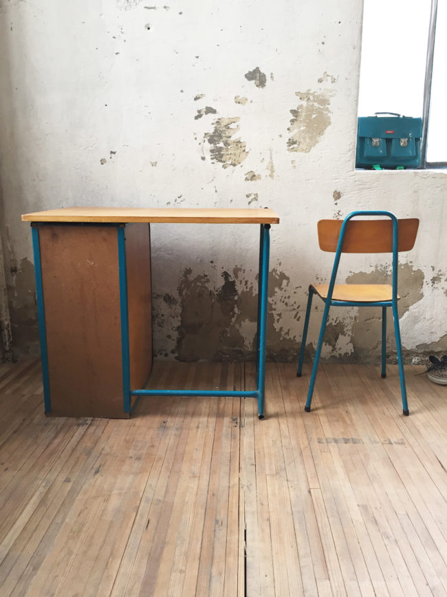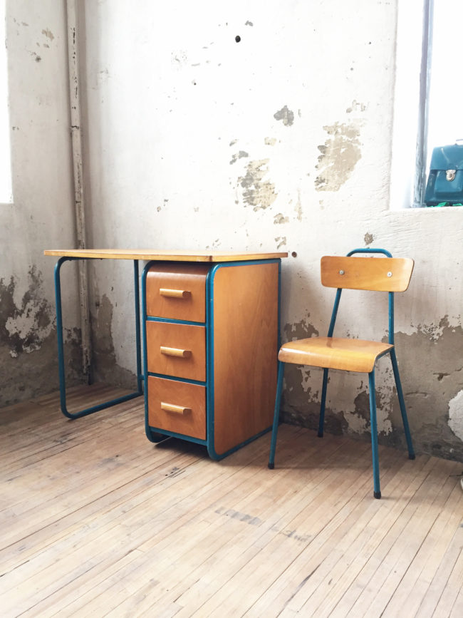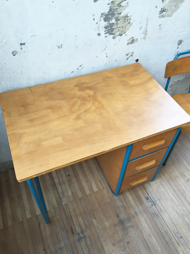 En chêne blond et piétement métallique bleu, ce duo bureau et chaises allient parfaitement le style vintage et industriel.