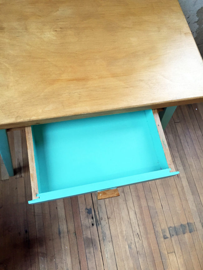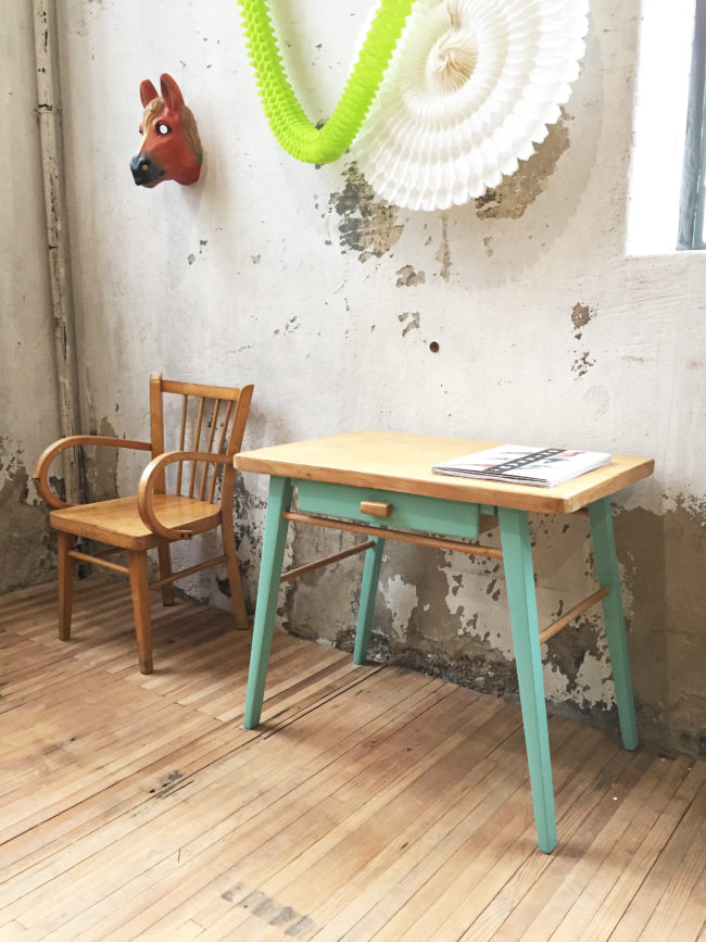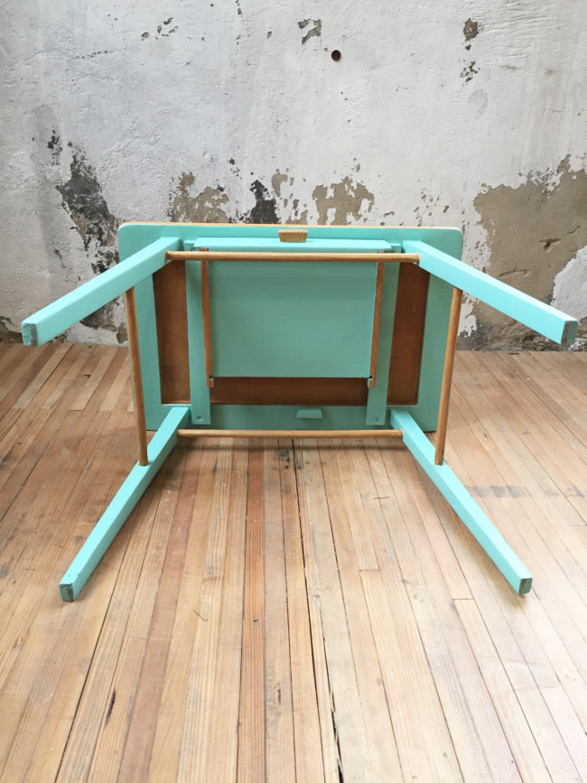 Le bureau a entièrement été poncé, puis repeint en partie en vert diabolo. Il a entièrement été protégé à l’aide d’un vernis transparent.