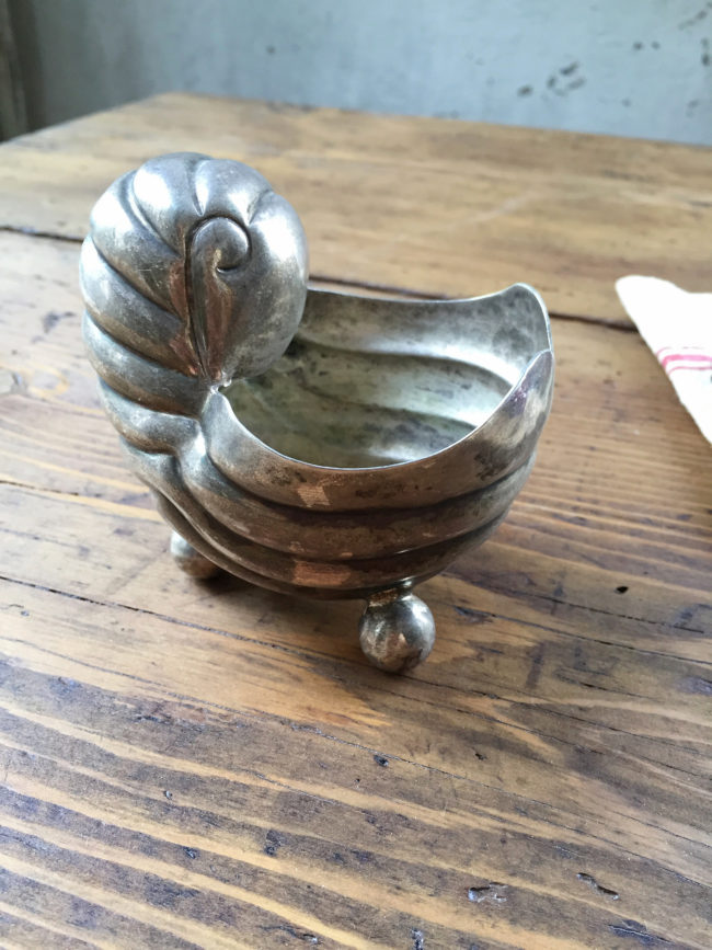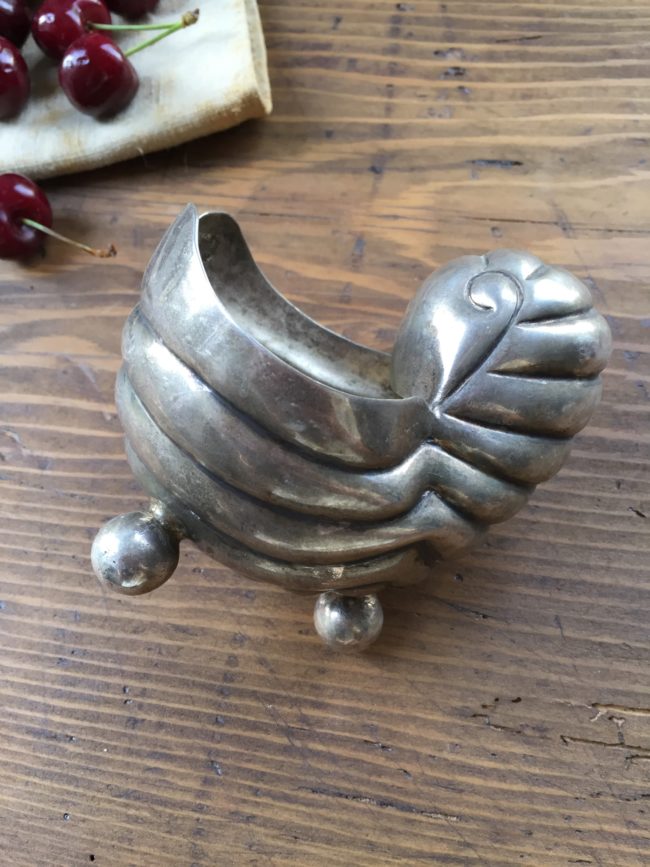 Ancien petit cendrier en métal argenté à forme de coquillage et piétement boule tripode.