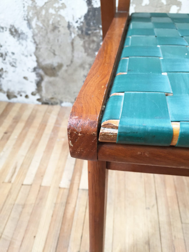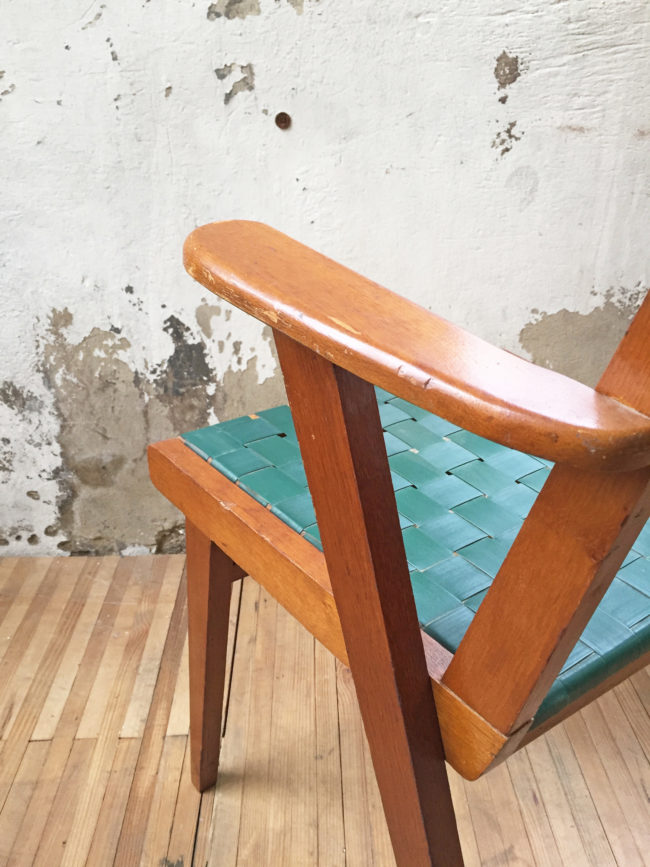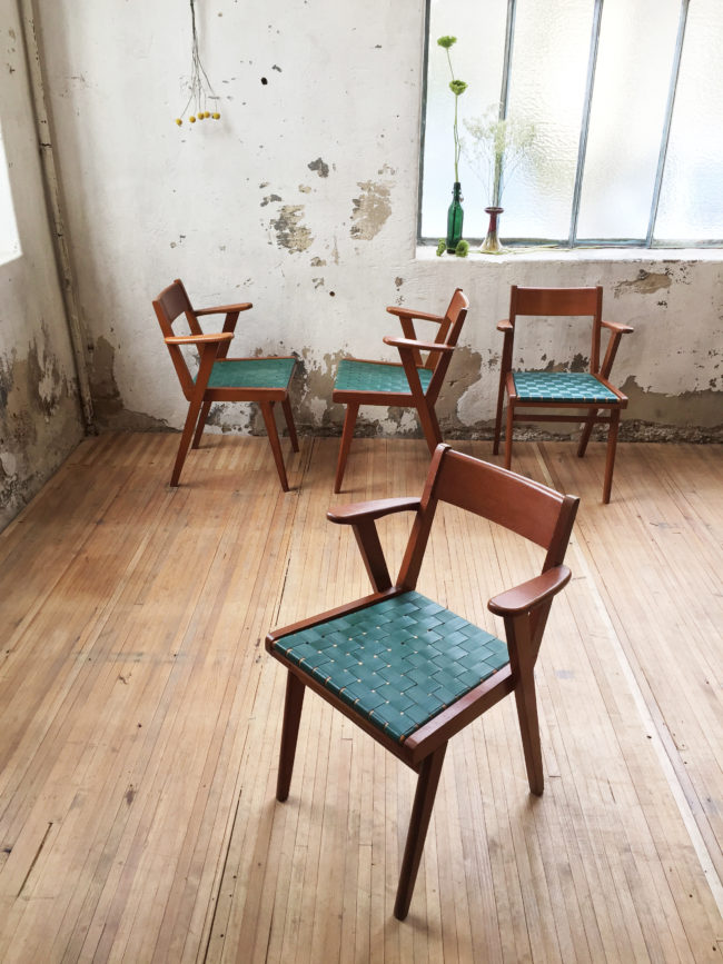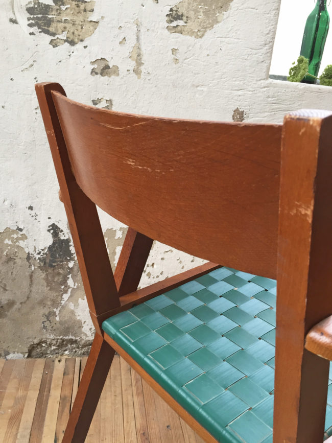 Quatre chaises avec accoudoirs en bois et assise tressée en plastique vert des années 50.
