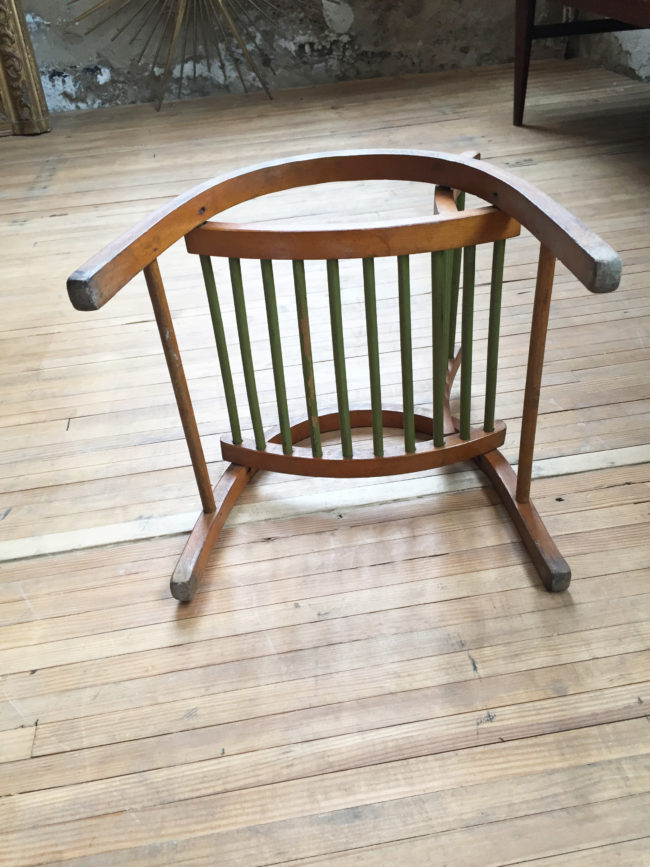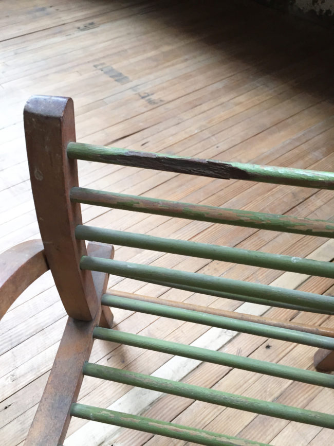 La structure est en hêtre courbé verni, l’assise et le dossier sont à barreaux peintes vert, patinés par le temps. Certaines lattes de l’assise portent les traces du temps, mais n’altèrent en rien la solidité de la chaise.