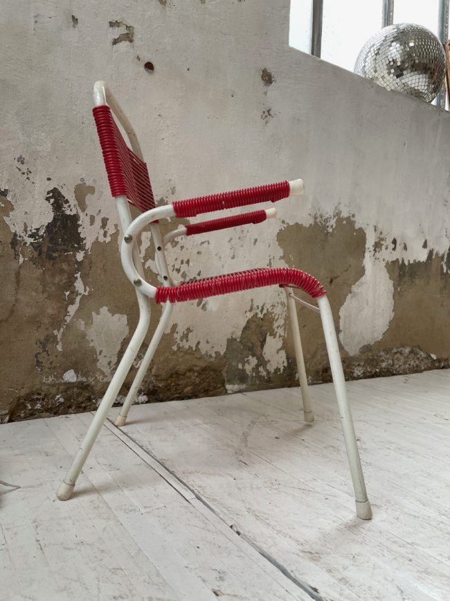 Ancienne petite chaise des années 70 en métal tubulaire blanc et fils soubidou pour l’assise et le dossier. Bel état du scoubidou, la peinture du métal a légèrement patiné par endroits comme l’attestent les photos, lui conférant tout son charme et son authenticité. Deux petits accoudoirs.