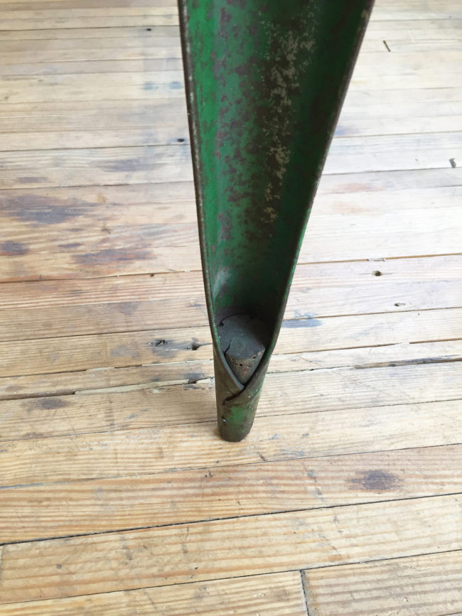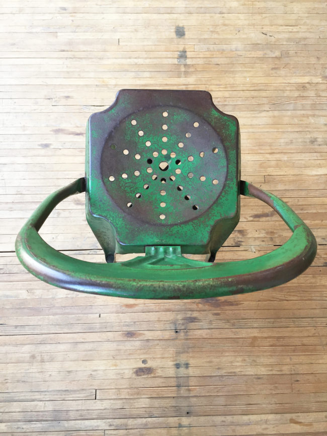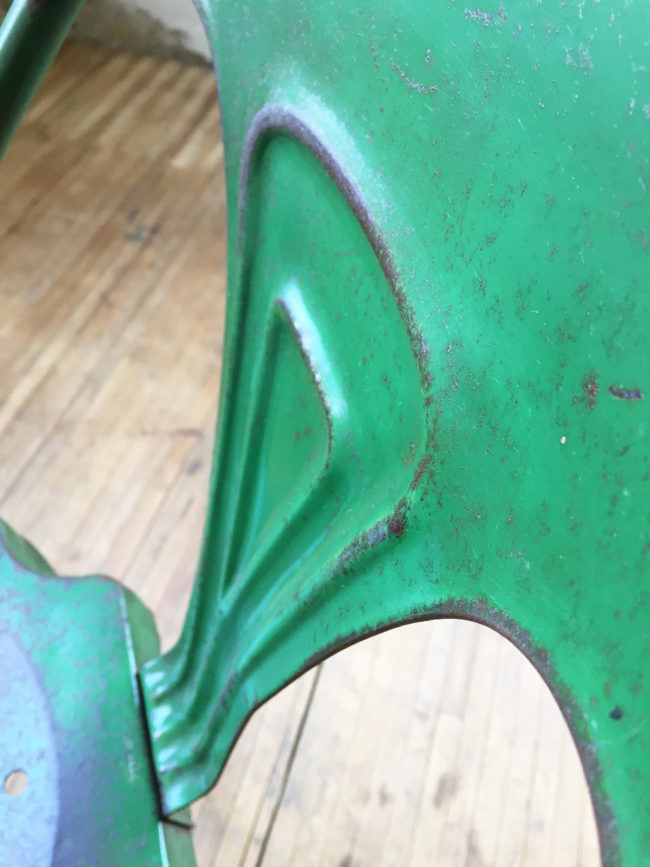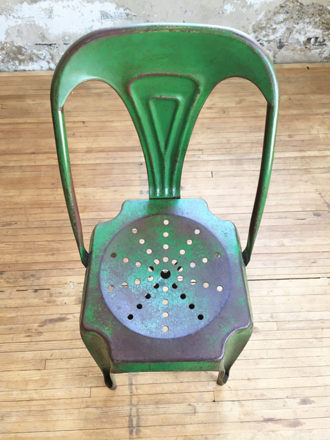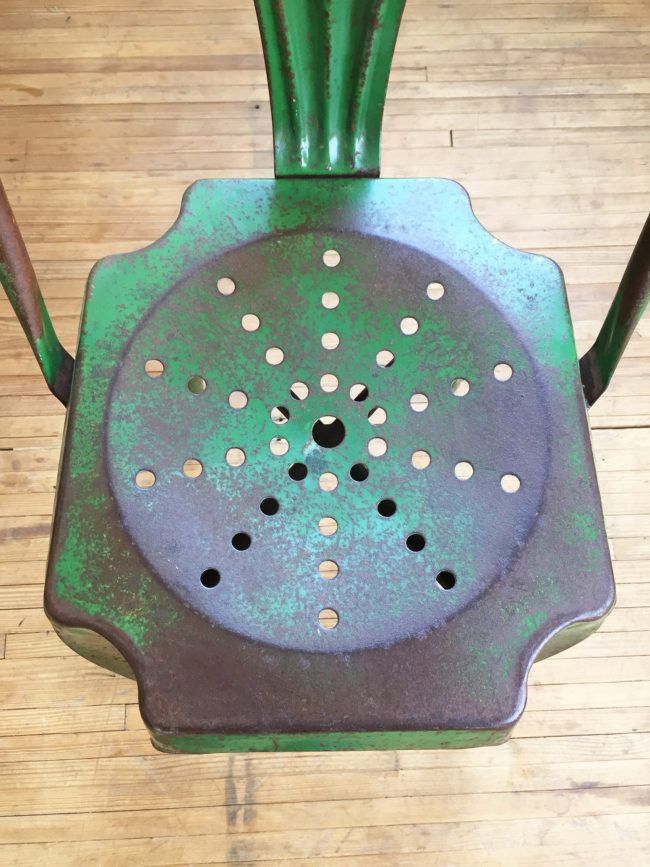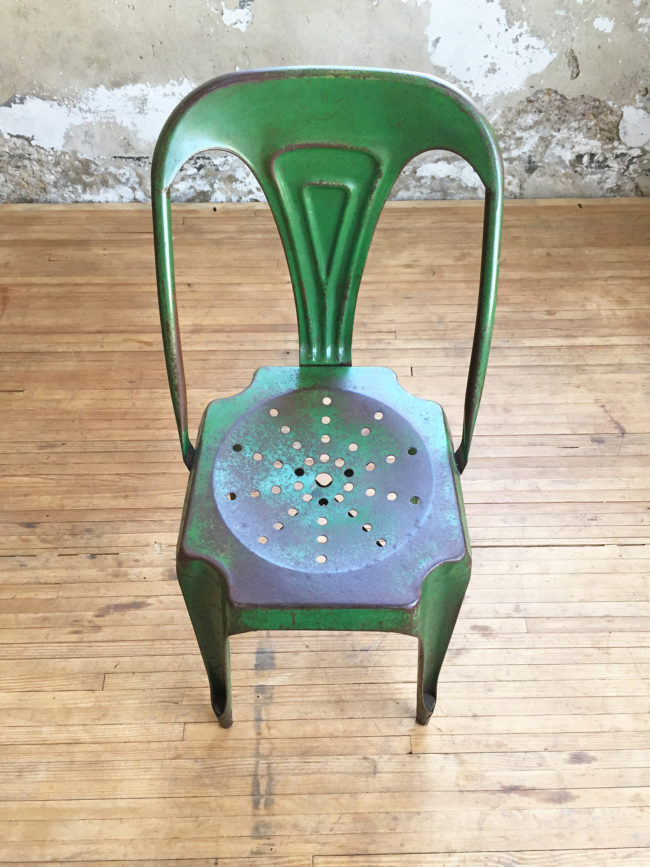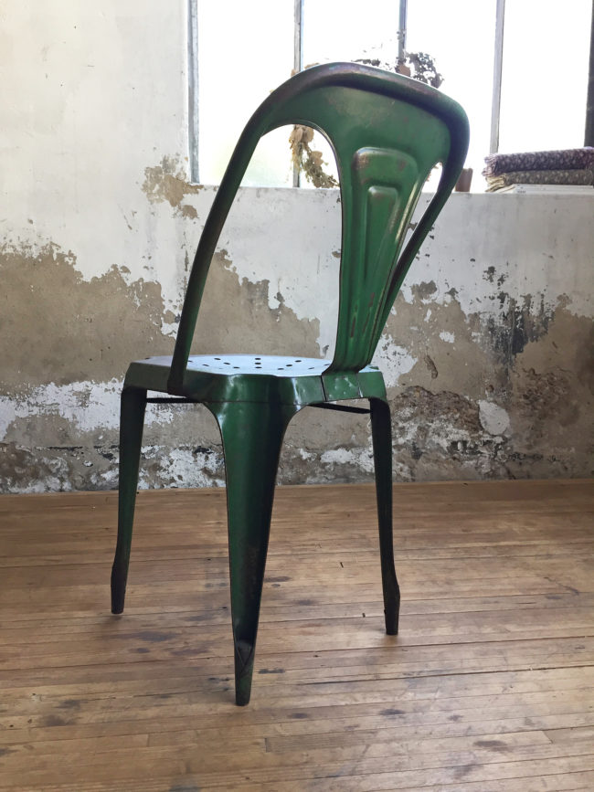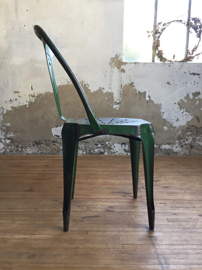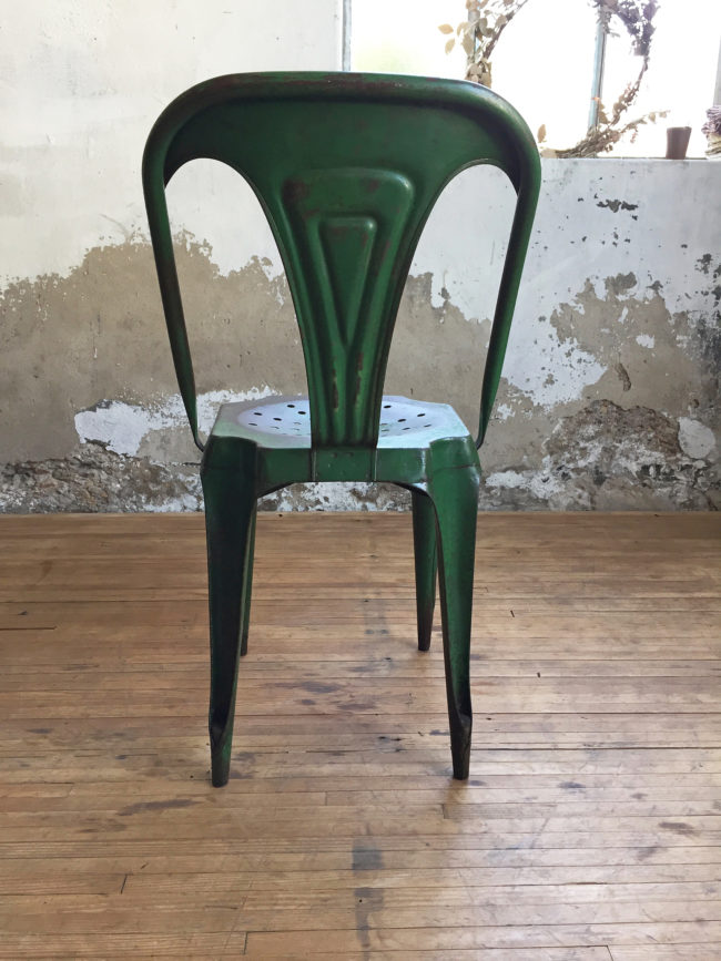 Ancienne chaise industrielle des années 30 en métal patiné vert conçue par Joseph Mathieu pour Multipl’s.