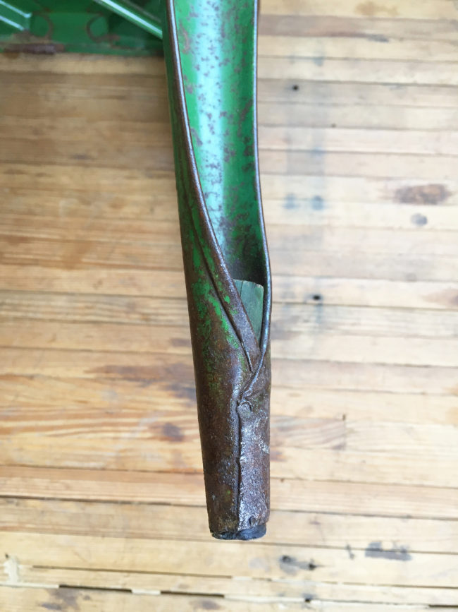La chaise a été brossée de manière à lui conserver sa couleur d’origine, puis entièrement protégée contre la rouille lui conférant une jolie patine légèrement brillante.