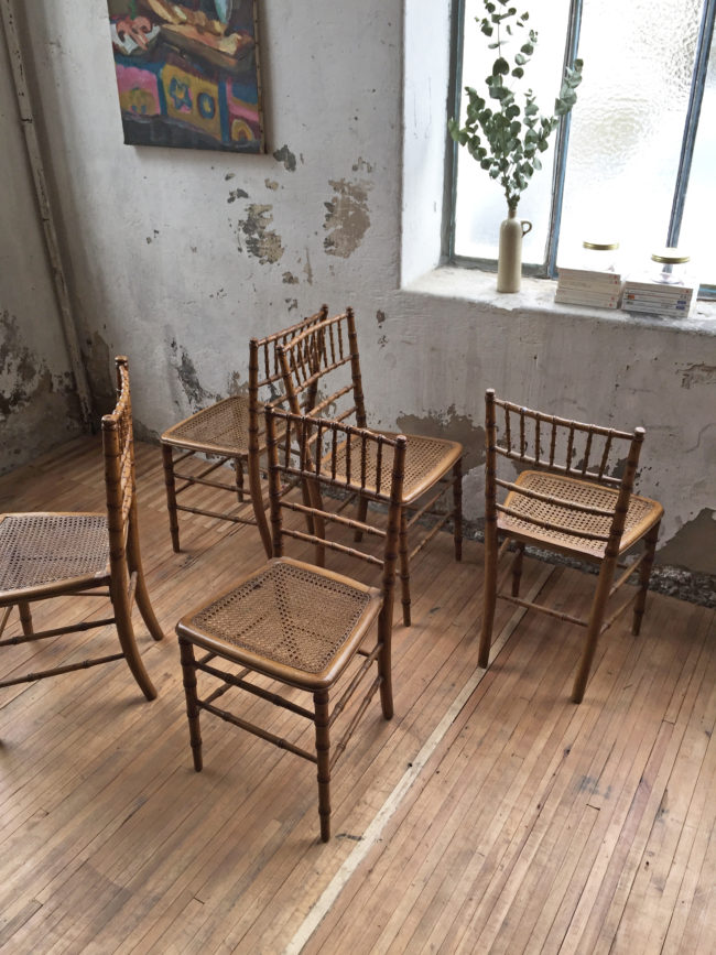 Chaque chaise, à l’assise cannée, est en bois tourné à l’imitation bambou.