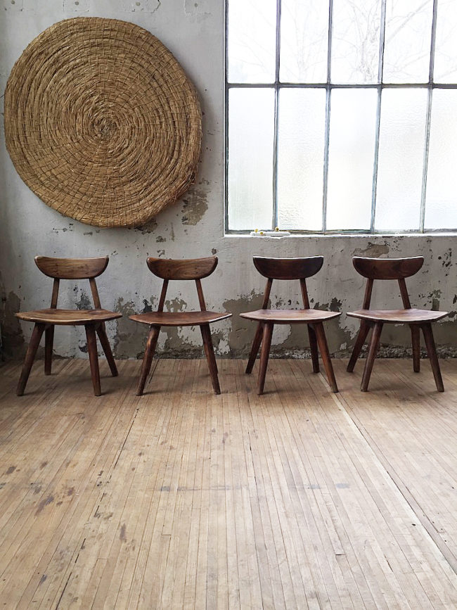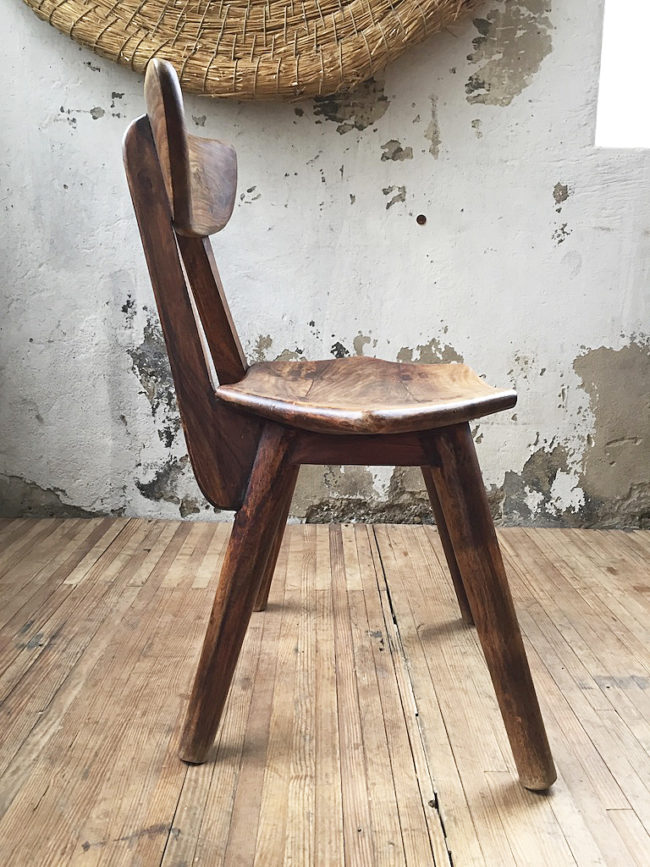 Lot composés de 4 chaises anciennes à l’aspect primitif ou brutaliste. Deuxième moitié XXème.