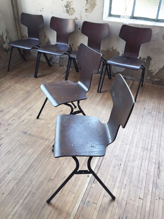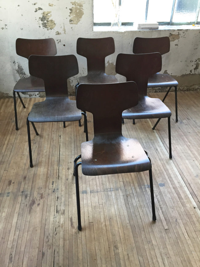 Superbe set composé de 6 chaises au design très proche des chaises « Marteau » de Jacobsen dans les années 60.