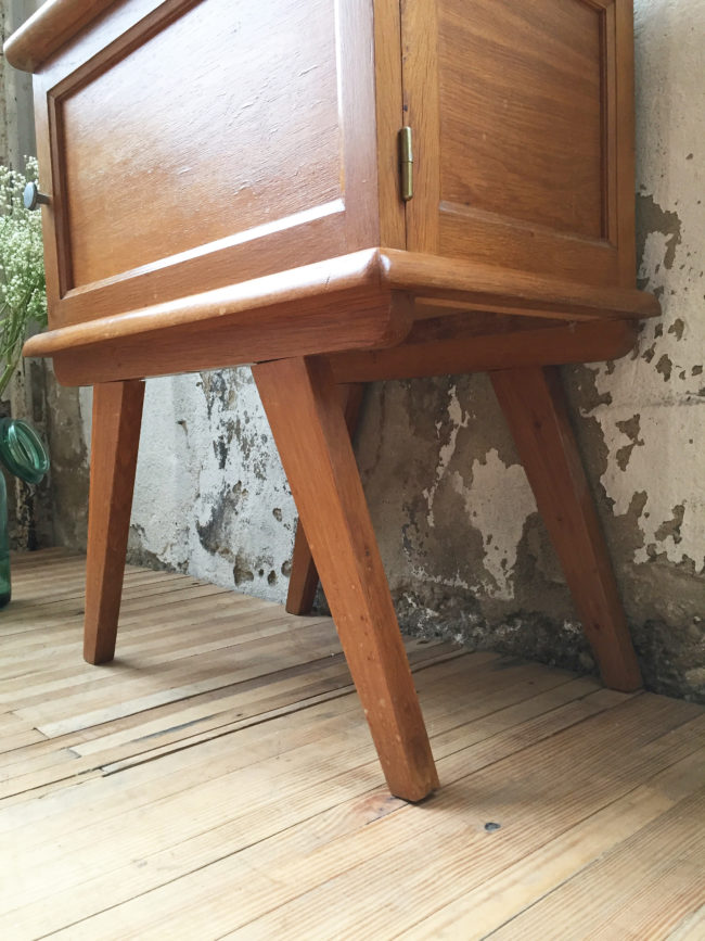 Des années 50, cette table de nuit possède un superbe look avec ses pieds compas.