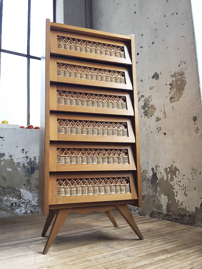 Chiffonier vintage en placage chêne et rotin.
