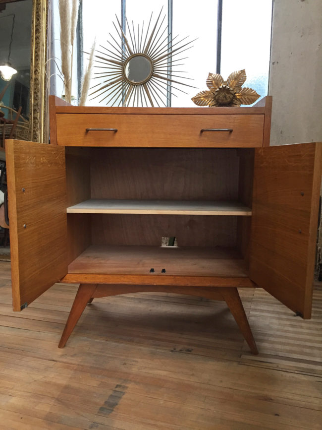 Ce meuble vintage permet un rangement confortable. Il possède des pieds compas et des poignées en laiton.