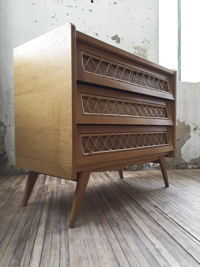 Commode vintage en placage chêne et rotin.