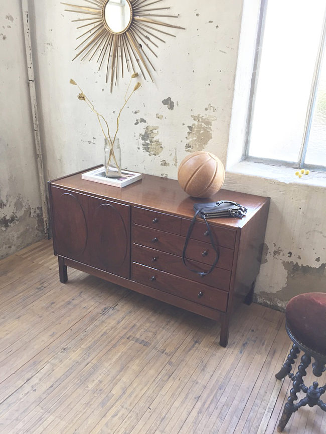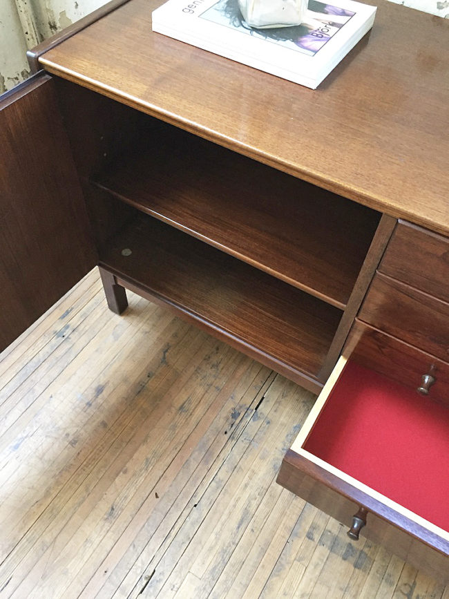 Avec son format compact et son design graphique, elle trouvera une place de choix partout dans votre intérieur. L’intérieur des tiroirs est recouvert d’un velours rouge en très bon état.