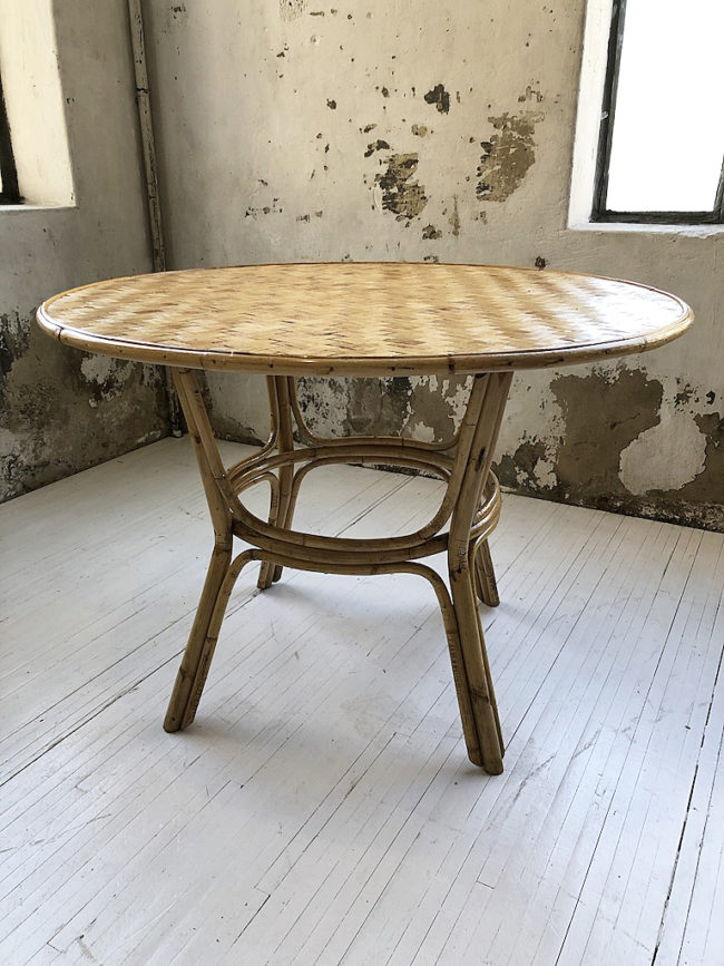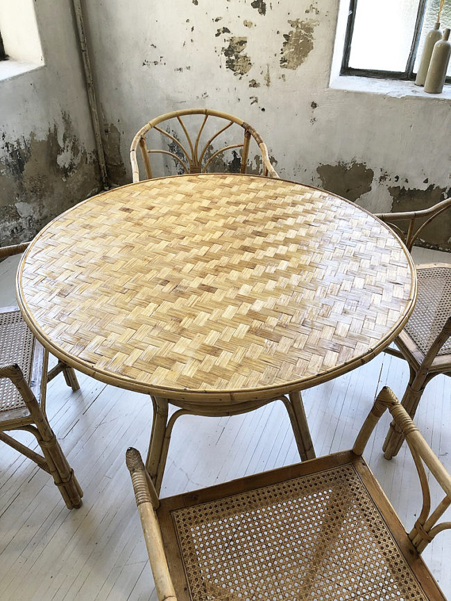 Ensemble ancien composé d’une grande table ronde et de ses 4 chaises à accoudoirs en rotin et cannage.
