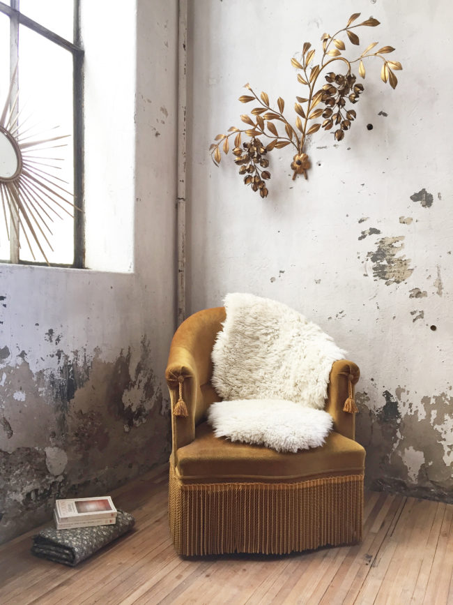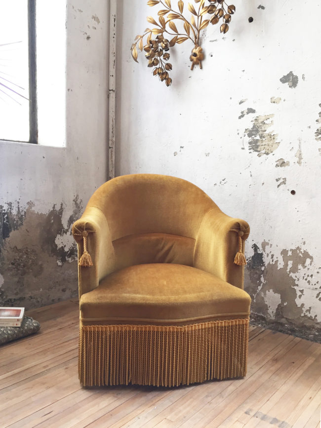Ancien fauteuil crapaud en velours jaune doré, couleur très lumineuse.