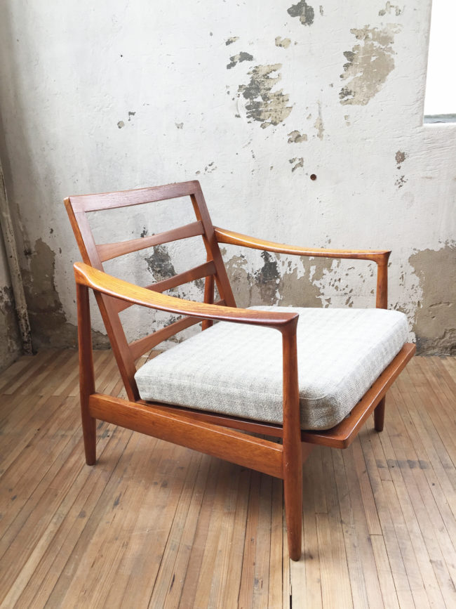 Actuellement le fauteuil ne possède qu’un coussin d’assise, dans un tissu lainé gris chiné d’origine.