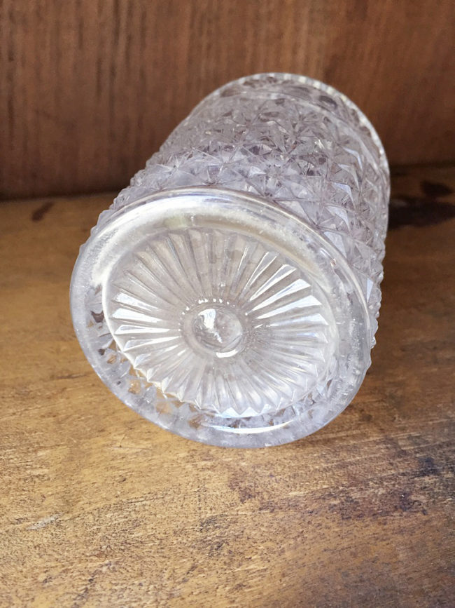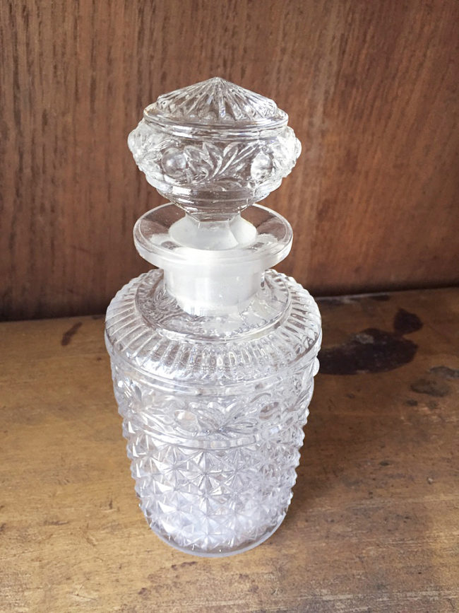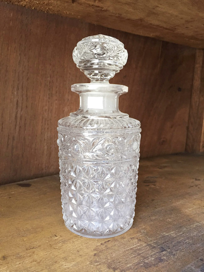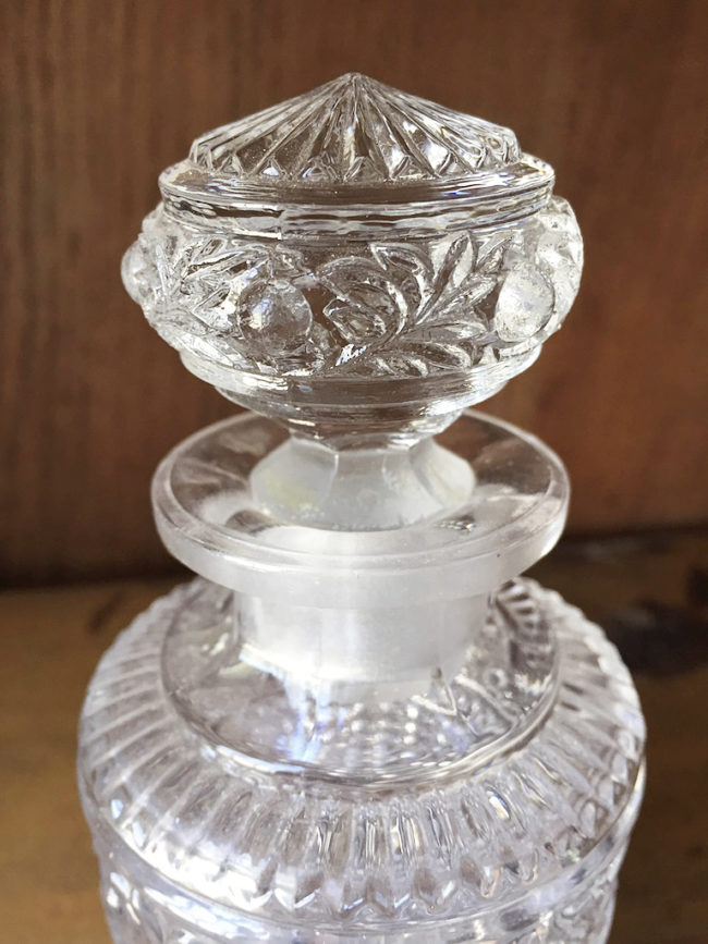 Très raffinée petite carafe ou petit pot à bouchon en verre ciselé.