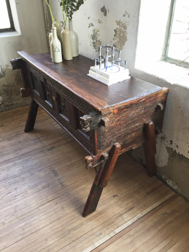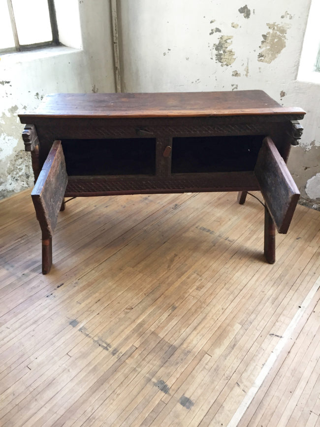 Entièrement en teck massif foncé, le meuble a été fabriqué de manière artisanale.